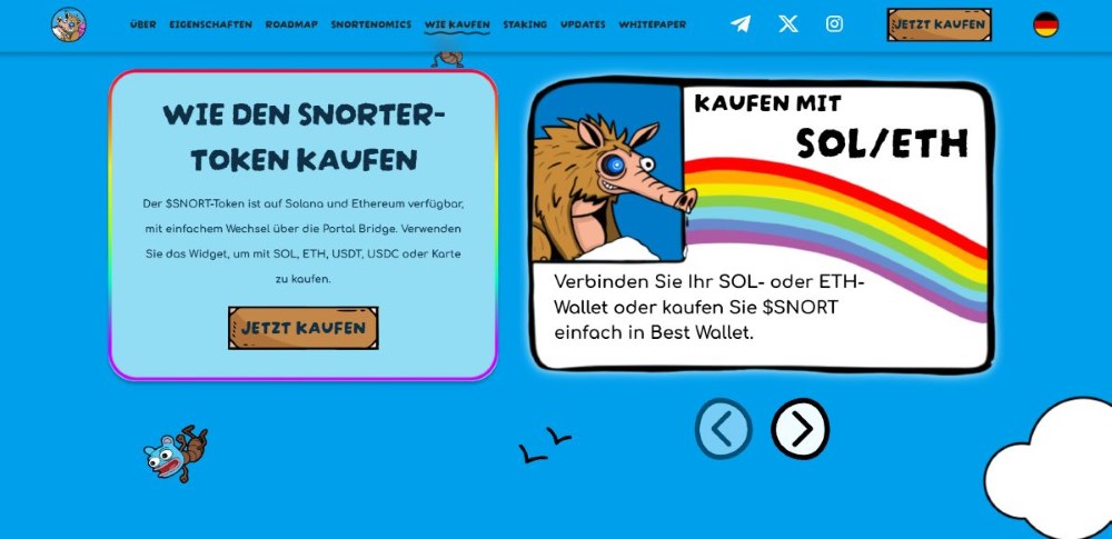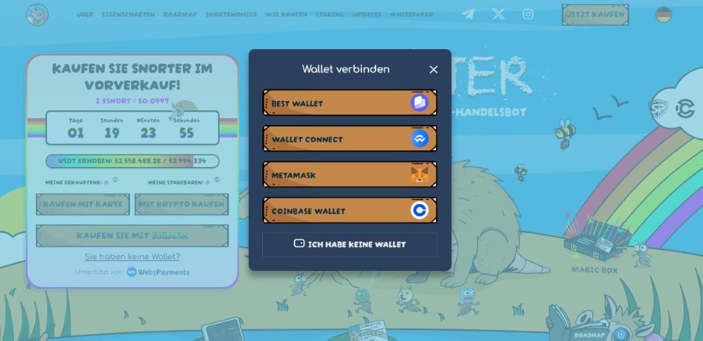 Besuchen Sie ausschließlich die offizielle Website snortertoken.com, um Betrugsversuche zu vermeiden, da Scammer häufig gefälschte Websites mit ähnlichen Domains erstellen. Auf der Hauptseite finden Sie prominent platziert den „Jetzt kaufen“ Button, der Sie direkt zum Presale-Widget weiterleitet.