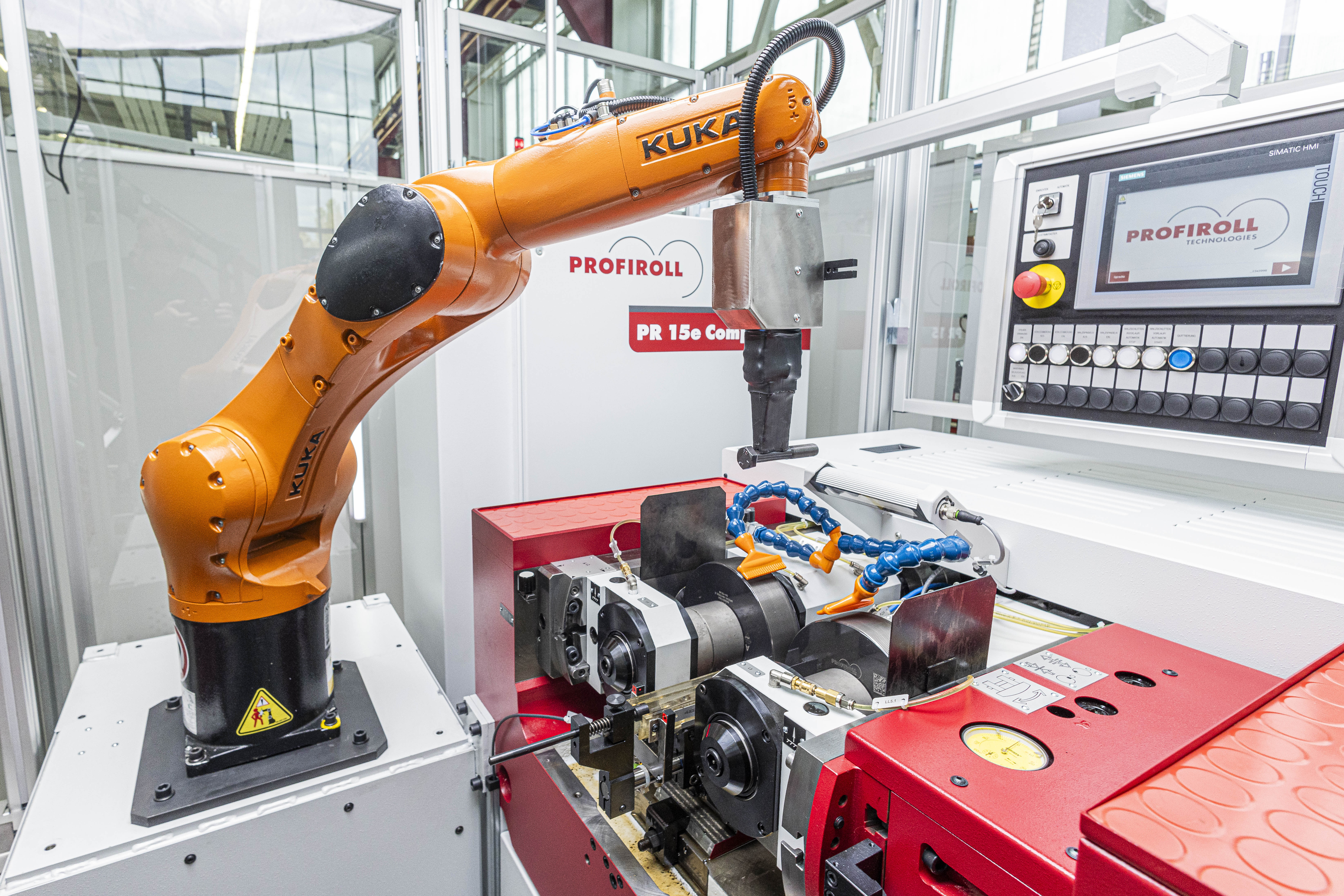 Weiterhin wird eine Demonstratorzelle präsentiert, die die Möglichkeiten moderner Robotertechnik in Verbindung mit optoelektronischen Systemen zeigt. Dabei wird eine Gewindewalzmaschine PR 15e compact mit elektromechanischen Antrieben durch einen 6-Achs-Roboter mit integrierter Bildverarbeitung beladen. Diese sogenannte „Griff in die Kiste“-Technologie bzw. das Bin Picking wird in der Industrie zunehmend genutzt. Ein Mehrwert entsteht durch die von Profiroll entwickelte Bedienerführung. Diese ermöglicht dem Nutzer eine intuitive Handhabung, ohne dass Kenntnisse zur Robotersteuerung erforderlich sind.