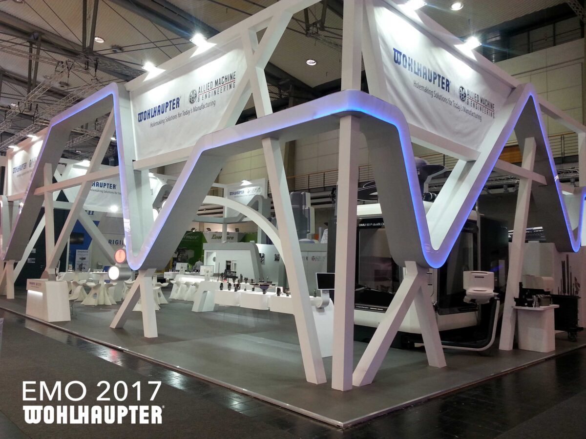 Der Stand von Wohlhaupter auf der EMO (Halle 4, Stand A04) ist wieder als amerikanische Sportsbar im „Industrial Look“ gestaltet.