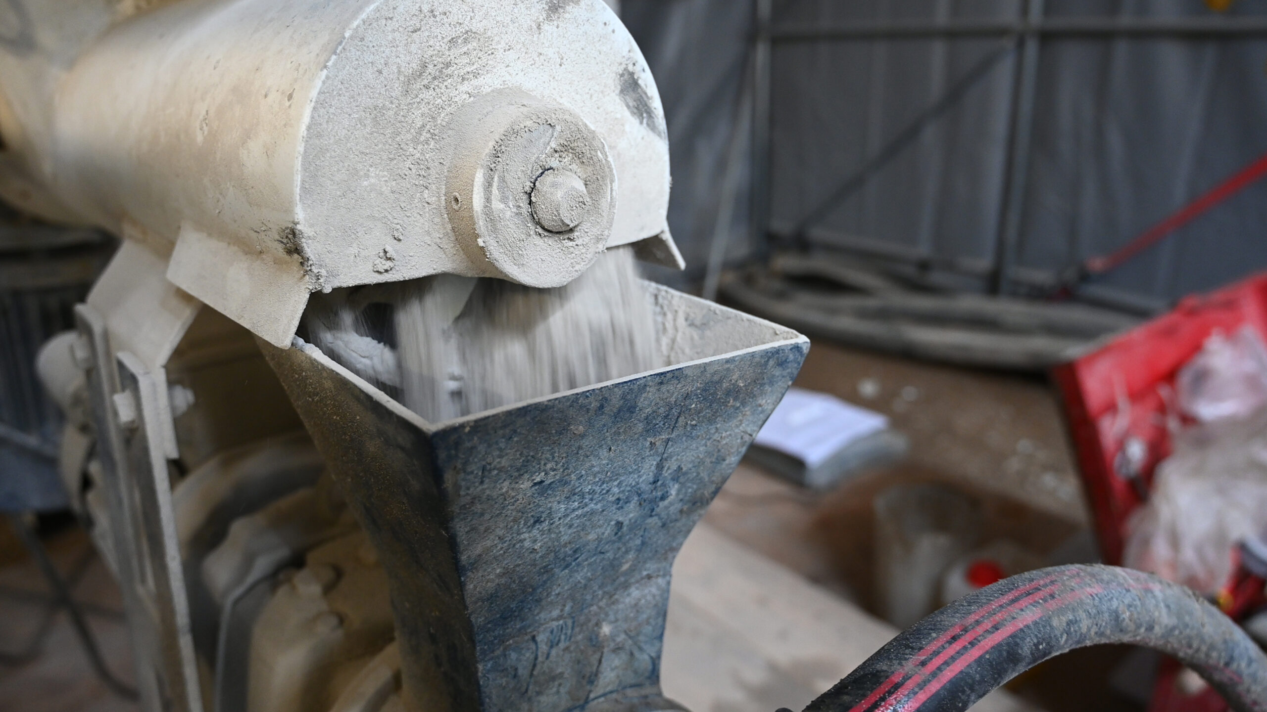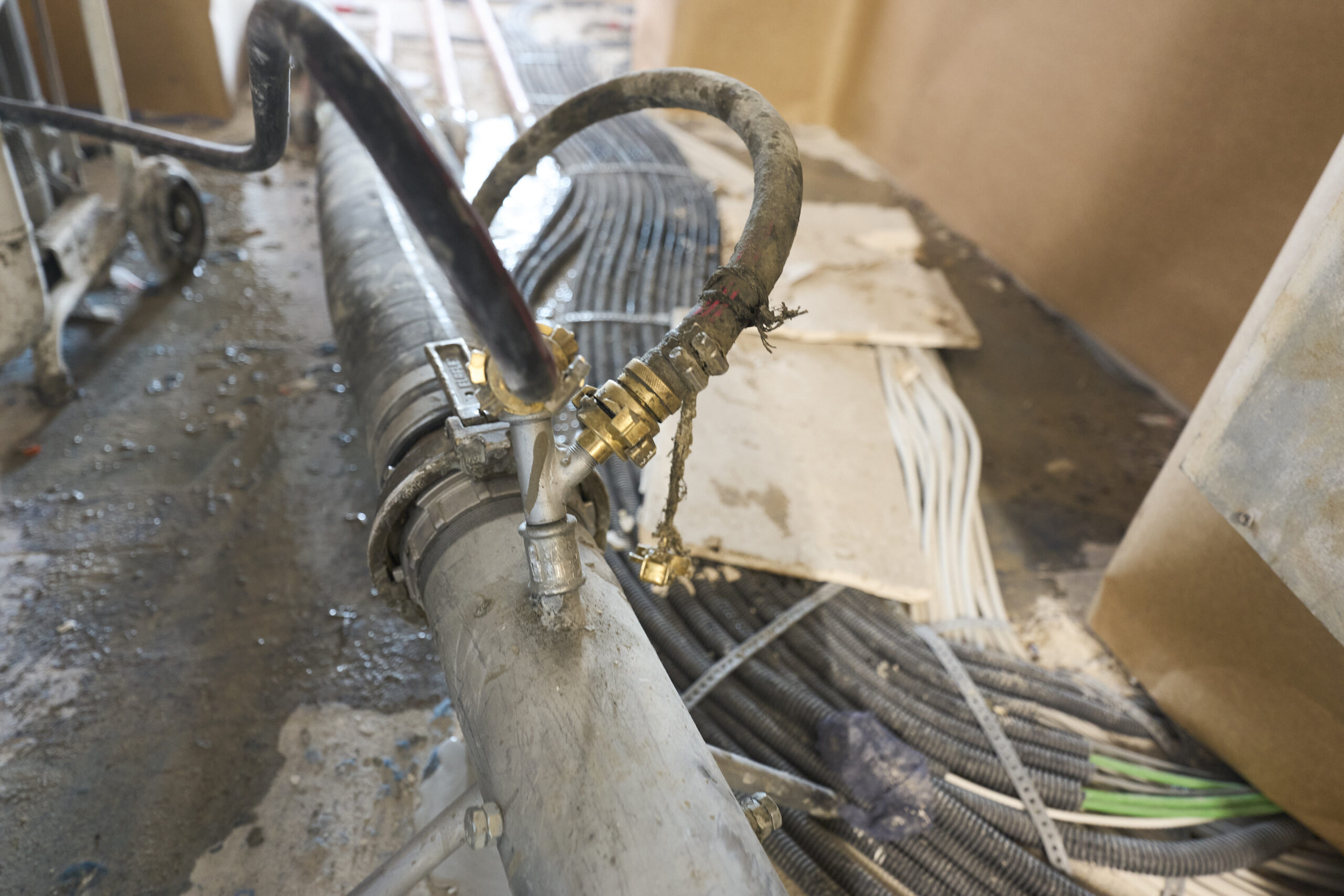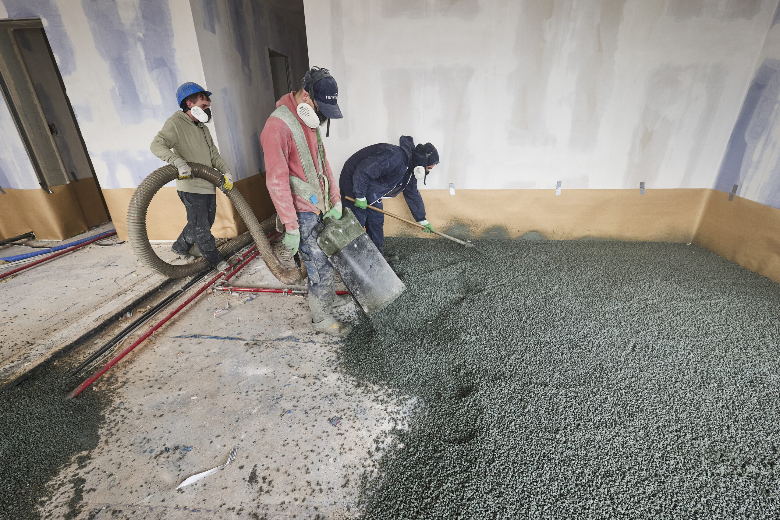 Beim „Roots“ wurde das Material für die Körper- und Trittschalldämmung in einem ausgeklügelten Verfahren per Hochdruck über ein zweigeteiltes Schlauchsystem vom Fuße des Gebäudes in die jeweilige Etage gepumpt. In einem Schlauch wurde grobkörniger Basaltsplit gefördert, im anderen das bereits gemischte 2-komponentige Spezialbindemittel Prefab Floor 2K von Remmers.