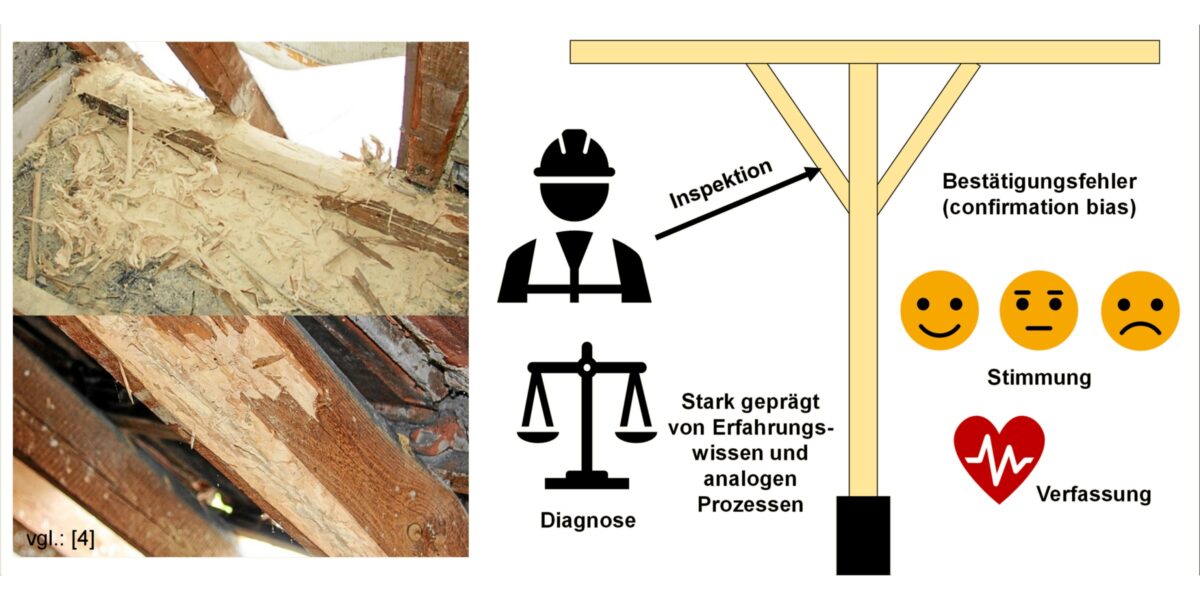 Links: Schäden holzzerstörender Insekten, rechts: Schematische dargestellte kognitive Verzerrungen des Sachverständigen. Grafik: R. Ott, C. Kreyenschmidt