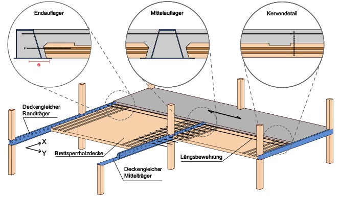 Konzept einer durchlaufenden BSP-Beton-Verbund-Flachdecke mit Anschlussdetails Grafik: Walter + Reif Ingenieurgesellschaft mbH