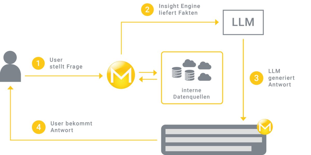 Die Insight Engine, eine KI-gestützte Wissensmanagement-Software, spielt dabei eine zentrale Rolle: Sie extrahiert relevante Fakten aus angebundenen Unternehmensdatenquellen und stellt sie dem LLM inklusive Quellenangaben zur Verfügung und das, ohne dass diese ihren ursprünglichen Speicherort verlassen.