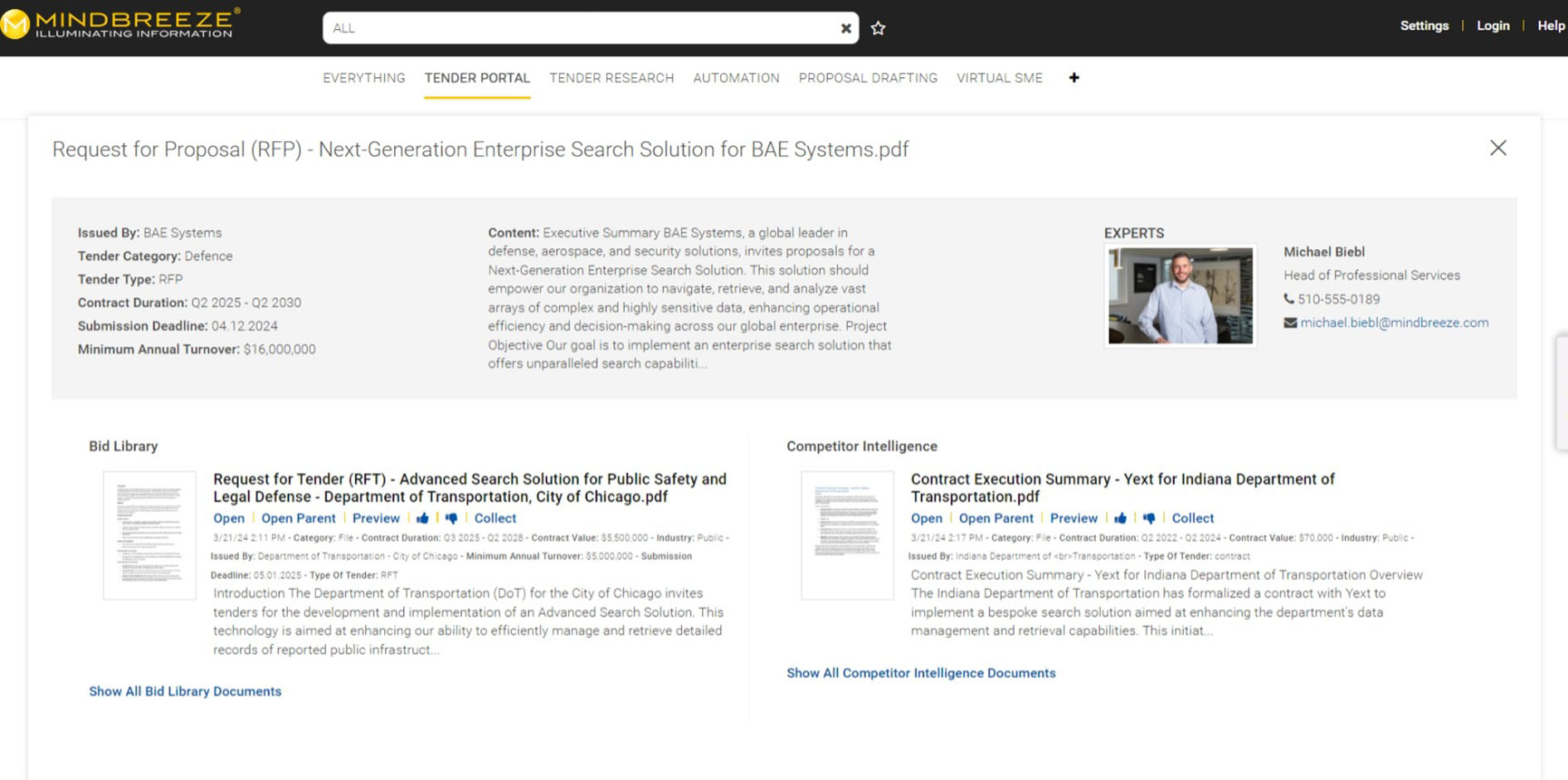 Insight Engines erstellen auf Knopfdruck 360-Grad-Sichten auf potenzielle Ausschreibungen. 360-Grad-Sichten konsolidieren Details aus einer vorliegenden Ausschreibung und relevanten artverwandten Projekten sowie internen Dokumentationen. Zusätzlich besteht auch die Möglichkeit Projektexperten zu identifizieren oder gar direkt ein komplettes Projektteam zusammenzustellen.
