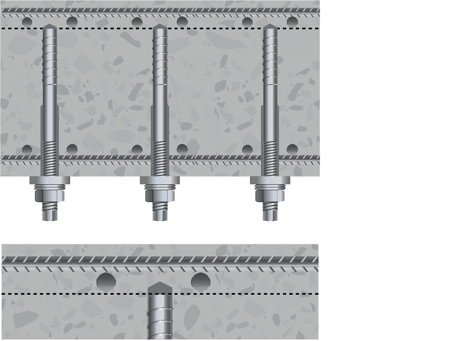 Die Verbundankerschrauben konnten an der Decke der Tiefgarage von der Unterseite her eingebracht werden. Vorteil des Systems ist, dass es ausreicht, die speziellen Schrauben bis zur Unterkante der oberen Plattenbewehrungslagen einzubringen (Bild 3). Hierdurch wird ausgeschlossen, dass es während der Bohrlocherstellung zu Beschädigungen der vorhandenen Bewehrung kommt.