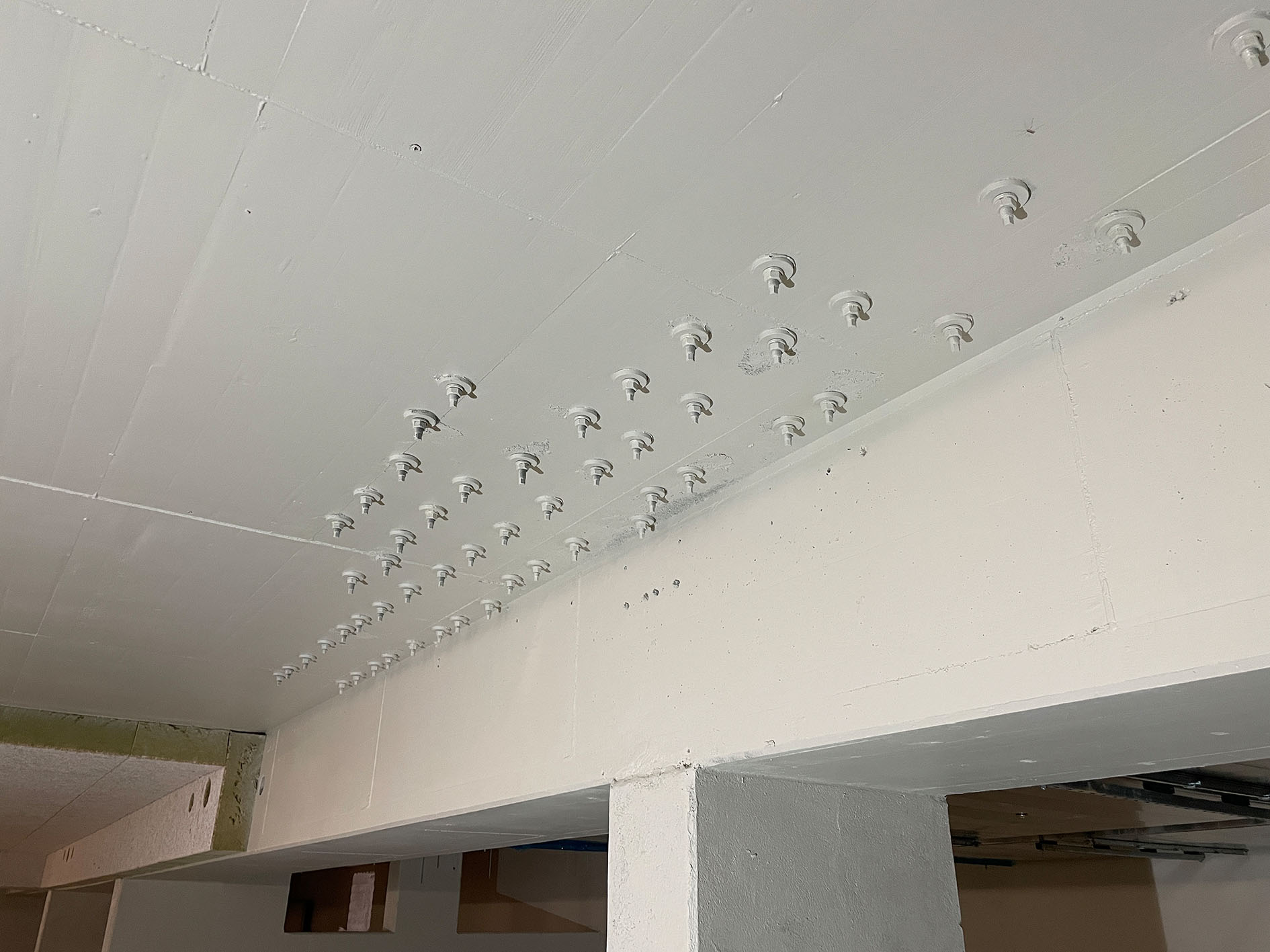 Nach dem zerstörungsfreien Detektieren und Markieren der beiden unteren Bewehrungslagen der Decke mit Hilfe von Bewehrungsscans wurden die Bohrungen nach den Plänen des Tragwerksplaners angezeichnet und die Verstärkungselemente installiert (Bild 4 und 5). Für die Überkopfbohrungen wurde eine eigens für diese Montage angepasste Bohrhilfe der ausführenden Firma verwendet.