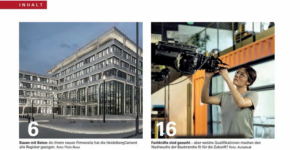 Inhaltsverzeichnis der Ausgabe 01-02|2022: Eine „Liebeserklärung an Beton“ ist der Neubau der Firmenzentrale der HeidelbergCement (links), während sich der Artikel aus der Rubrik Karriere (rechts) mit der Frage beschäftigt, ob Fachkräfte in der Baubranche ausreichend Kenntnisse in digitalen Technologien haben.