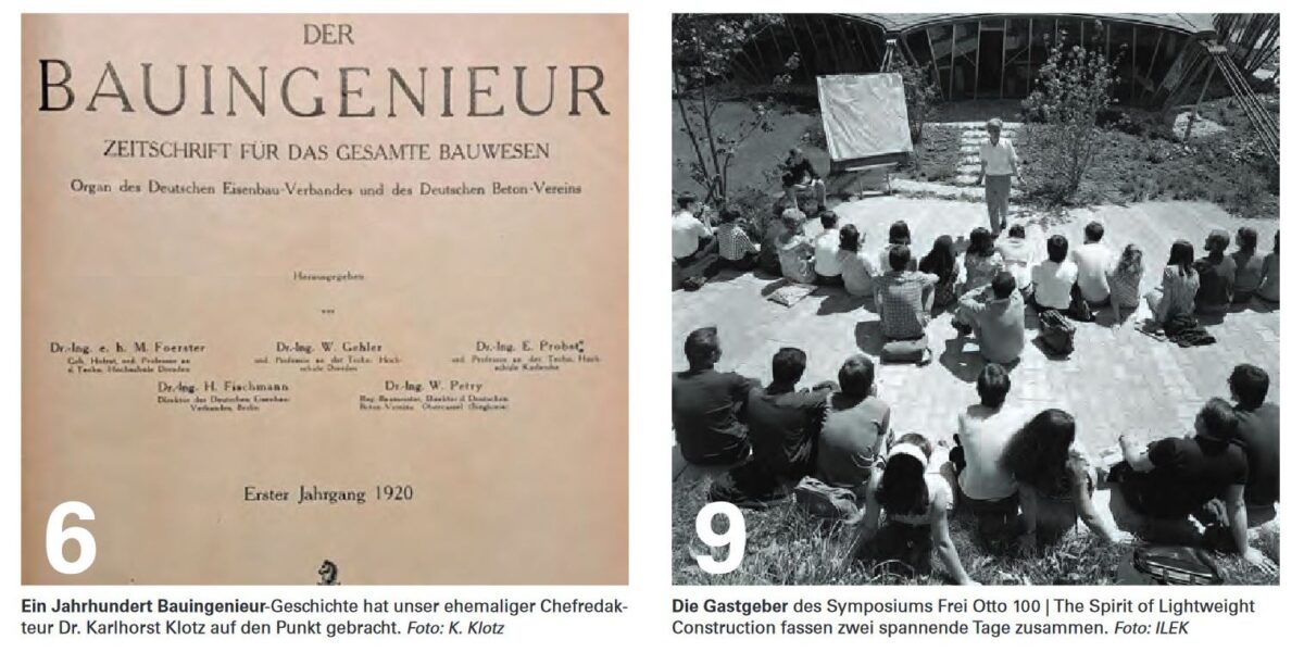 Zum Auftakt des Heftes plädiert Dipl.-Ing. Gerhard Breitschaft, Präsident des Deutschen Instituts für Bautechnik (DIBt), dafür künftig in erster Linie um- statt neu zubauen, weil dies klimagerecht, verantwortungsvoll und zukunftsweisend ist. Daneben unterstreicht er die Notwendigkeit, Bauaufgaben interdisziplinär anzugehen und gratuliert dem Bauingenieur zu 100 Jahren Vernetzungsarbeit, und zwar sowohl was Wissenschaft, Wirtschaft und Verwaltung betrifft als auch die Disziplinen Massivbau, Geotechnik und das Baumanagement bis hin zur digitalen Transformation im Bauwesen. Anschließend fasst unser ehemaliger Chefredakteur Dr. Karlhorst Klotz 100 Jahre Bauingenieur Geschichte prägnant zusammen.