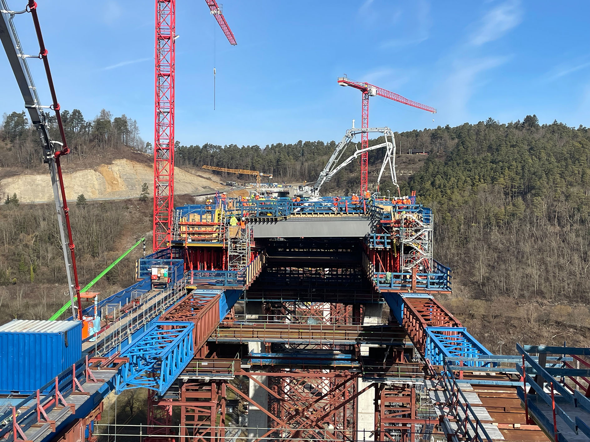 „Derzeit arbeiten wir mit einer Reihe an Maßnahmen daran, den Bauablauf weiter zu optimieren“, erklärt Projektleiter Markus Jahn und ergänzt: „So werden wir zum Beispiel im Herbst 2025 die rund 60 Meter langen und bis 14 Zentimeter dicken Grobbleche, mit denen die Stege zwischen den Vouten verstärkt werden, mit einem 700-Tonnen-Raupenkran auf die Traggerüste auflegen.“