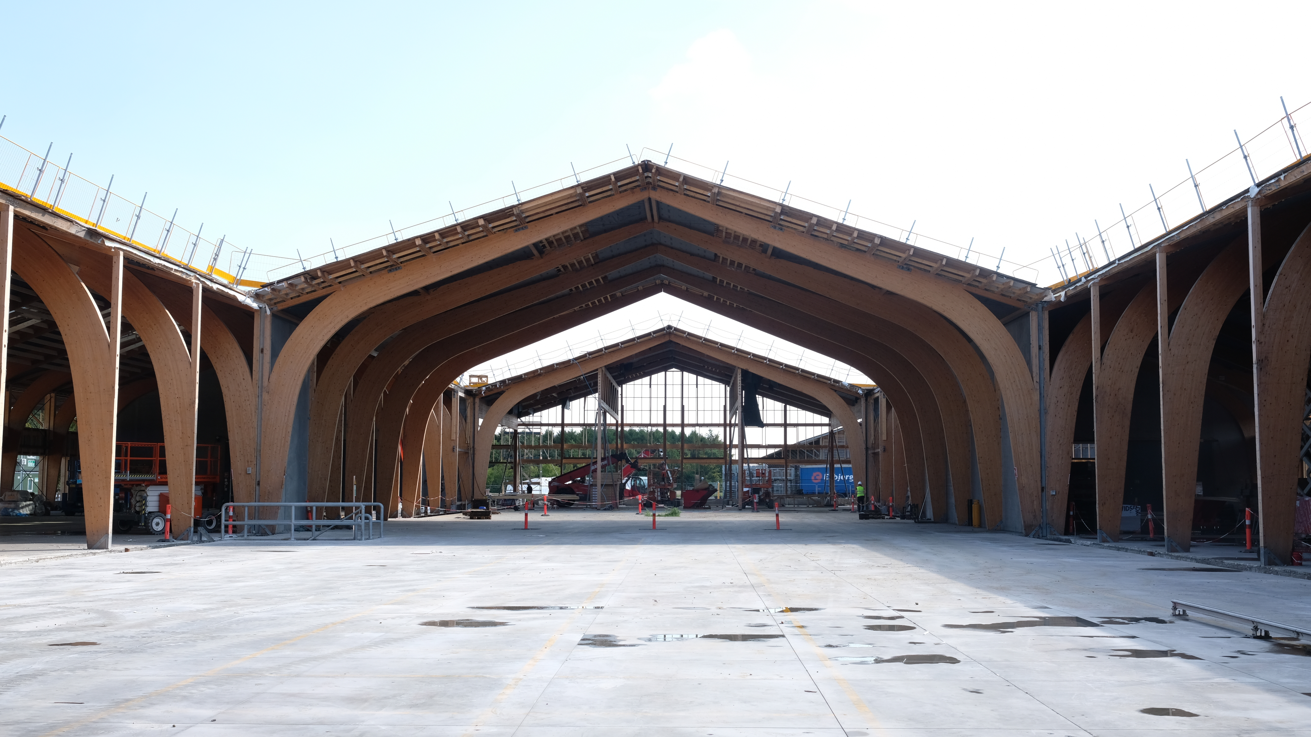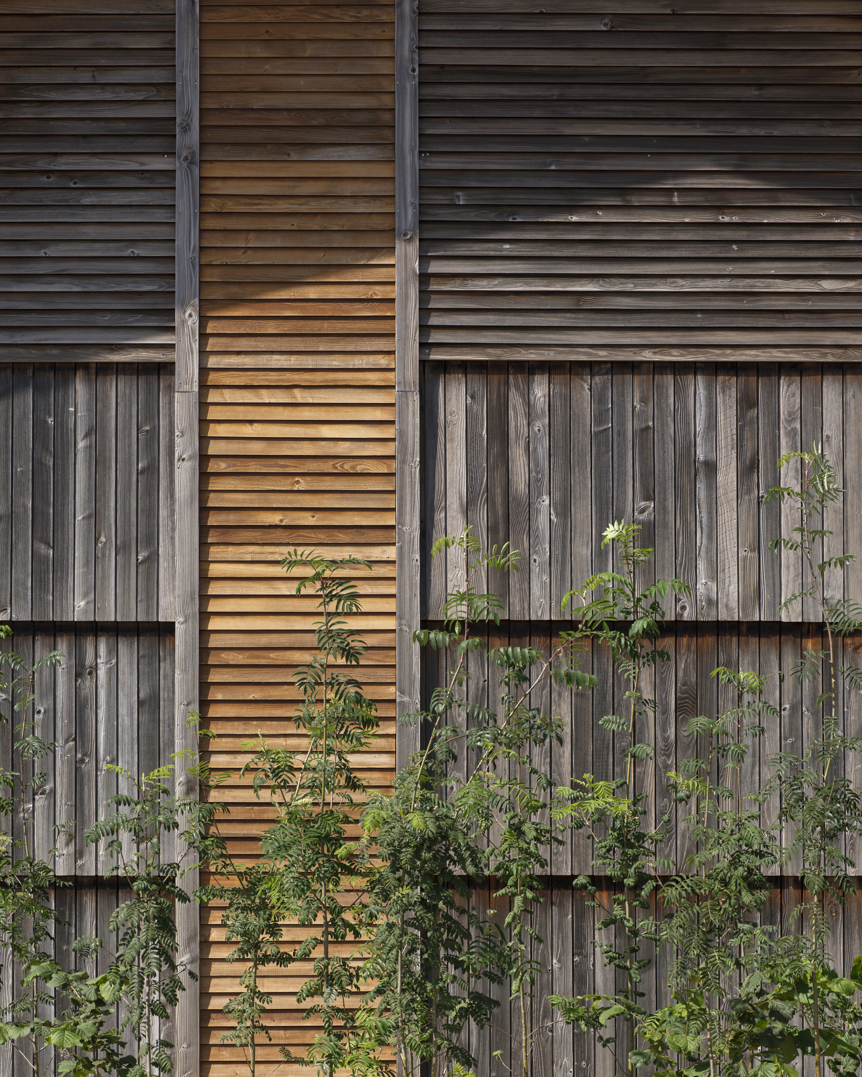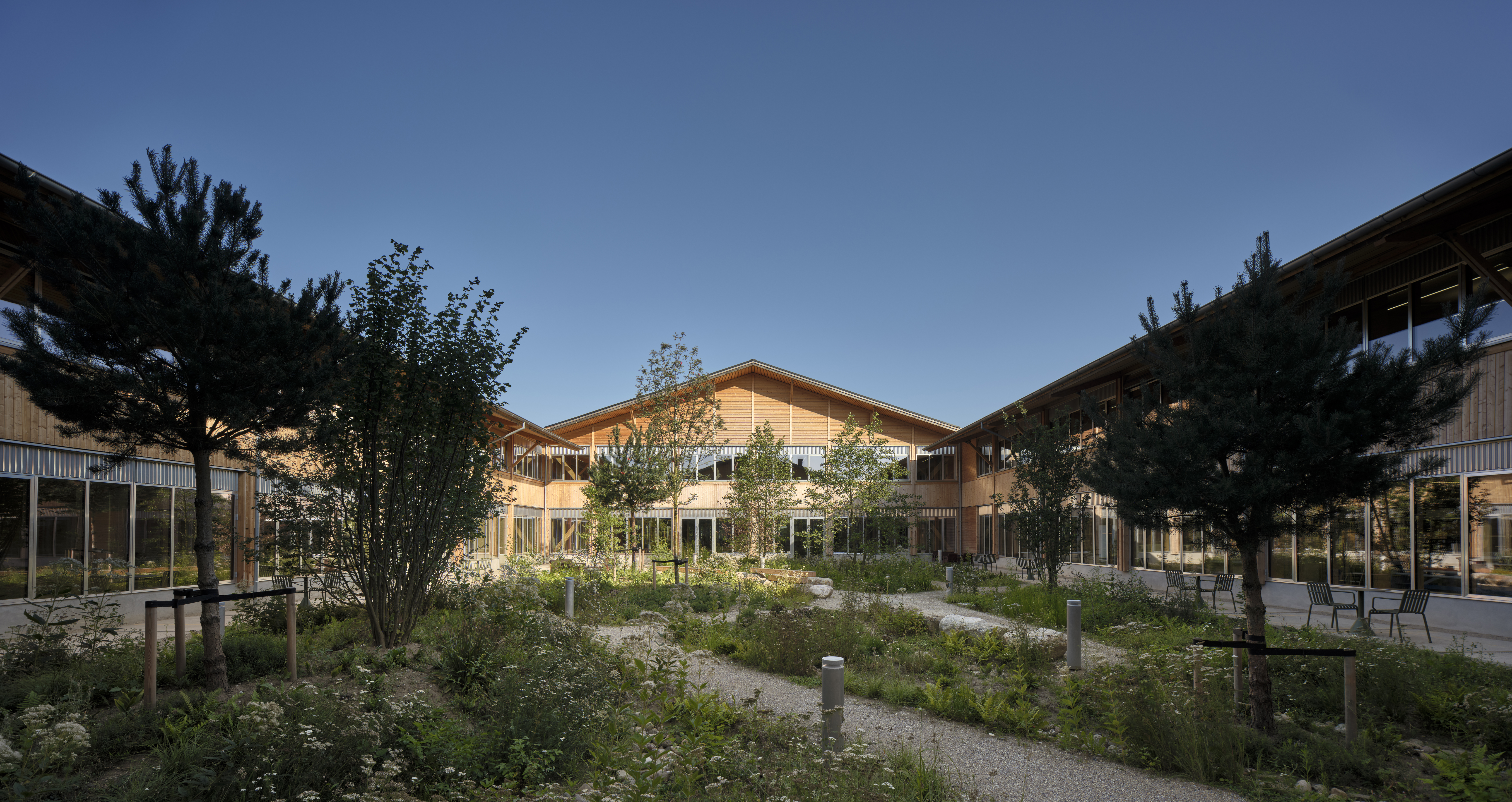 Wesentlich dafür waren der Erhalt oder die Umnutzung der ursprünglichen Betonplatte, bestehenden Dachkonstruktionen und tragenden Holzbalken aus Brettschichtholz sowie der hölzernen Fassaden, Dachüberstände und inneren Betonwände. So wurde das Holz der bestehenden Fassade für die Dämmung der Außenwand demontiert und anschließend wieder montiert. Die in den Ausschnitten für die Innenhöfe entfernten Brettschichtholzrahmen kamen etwa in Nebengebäuden des umliegenden Gebiets oder geupcycelt für den Bau von Möbeln wieder zum Einsatz. Die vorhandene Dachfläche erhielt nur eine neue Dämmung und neue Oberlichter. Die Holzschnitte aus den neuen Fensteröffnungen kamen bei den neuen Fassaden in den Innenhöfen zum Einsatz. Weiteres Holz aus dem Bestand wurde verwendet, um notwendige Wartungen und den Austausch von Elementen zu realisieren.