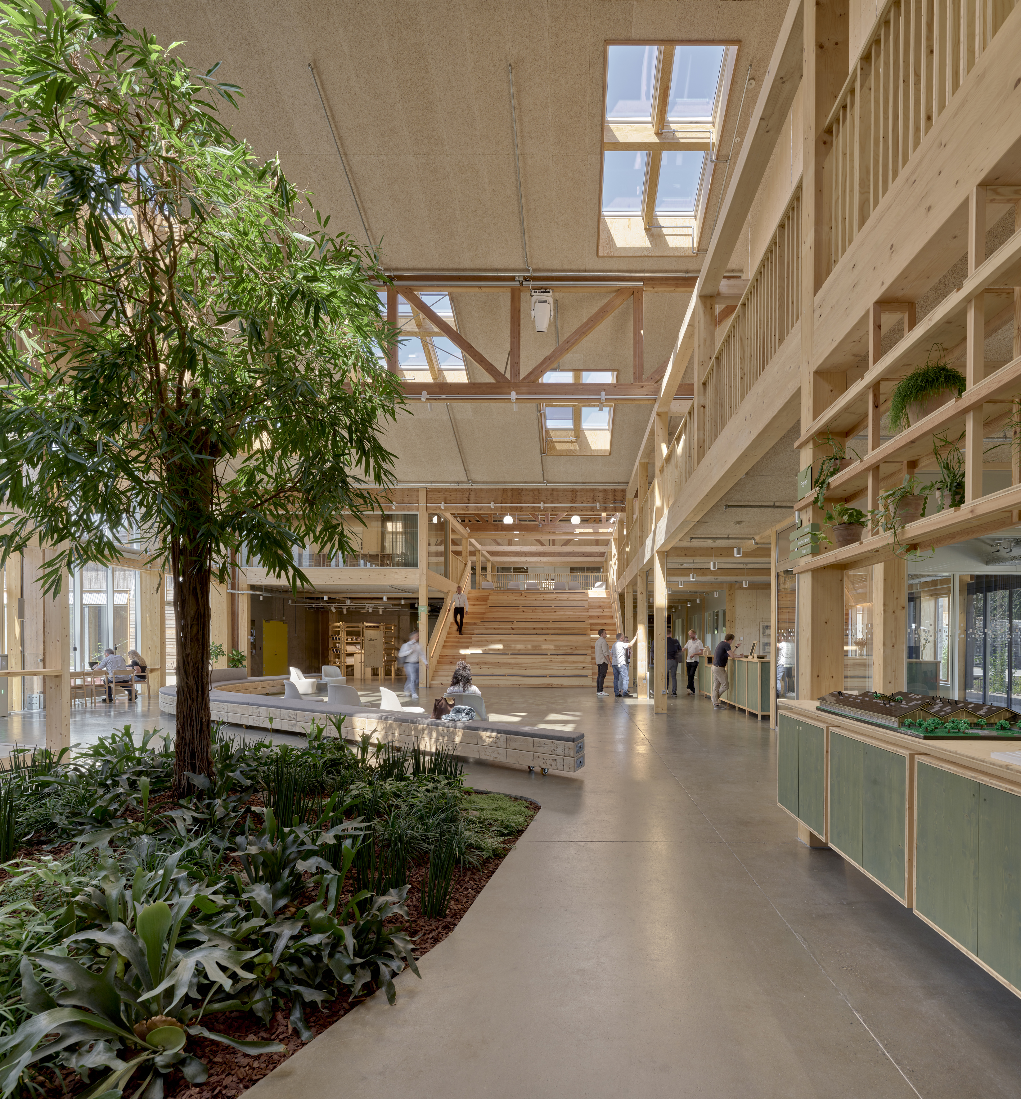 Das Foyer mit seiner hohen Decke dient als dynamische Fläche zum Beispiel für Ausstellungen und Besprechungen sowie als Showroom, Lounge und Empfangsbereich. Es bietet eine direkte Verbindung zu den Werkstätten, den Büroräumen und dem Auditorium. Die Werkstätten befinden sich in dem Flügel links des Foyers und bieten vielfältige Möglichkeiten zur Präsentation von Innovationen. Zudem gewährleistet ihre Lage gute Bedingungen für Lieferungen von der Südfassade aus. Die Büroräume sind entsprechend der internen Zusammenarbeit einzelner Arbeitsfelder und je nach dem erforderlichen Grad an Vertraulichkeit angeordnet. Die meisten befinden sich im Flügel rechts des Foyers an der Nordfassade, sodass sie eine schöne Aussicht bieten, ohne sie vor direkter Sonneneinstrahlung schützen zu müssen. Weitere Arbeitsplätze sind in Nischen und vielen kleinen Zonen neben offenen Bereichen in großen Teilen des Gebäudes zu finden. Wer vom Eingang aus zweimal rechts geht, erreicht das Forum – ein Schauplatz für ständig wechselnde Veranstaltungen, Vorträge und Konferenzen, die Menschen aus aller Welt zusammenbringen.