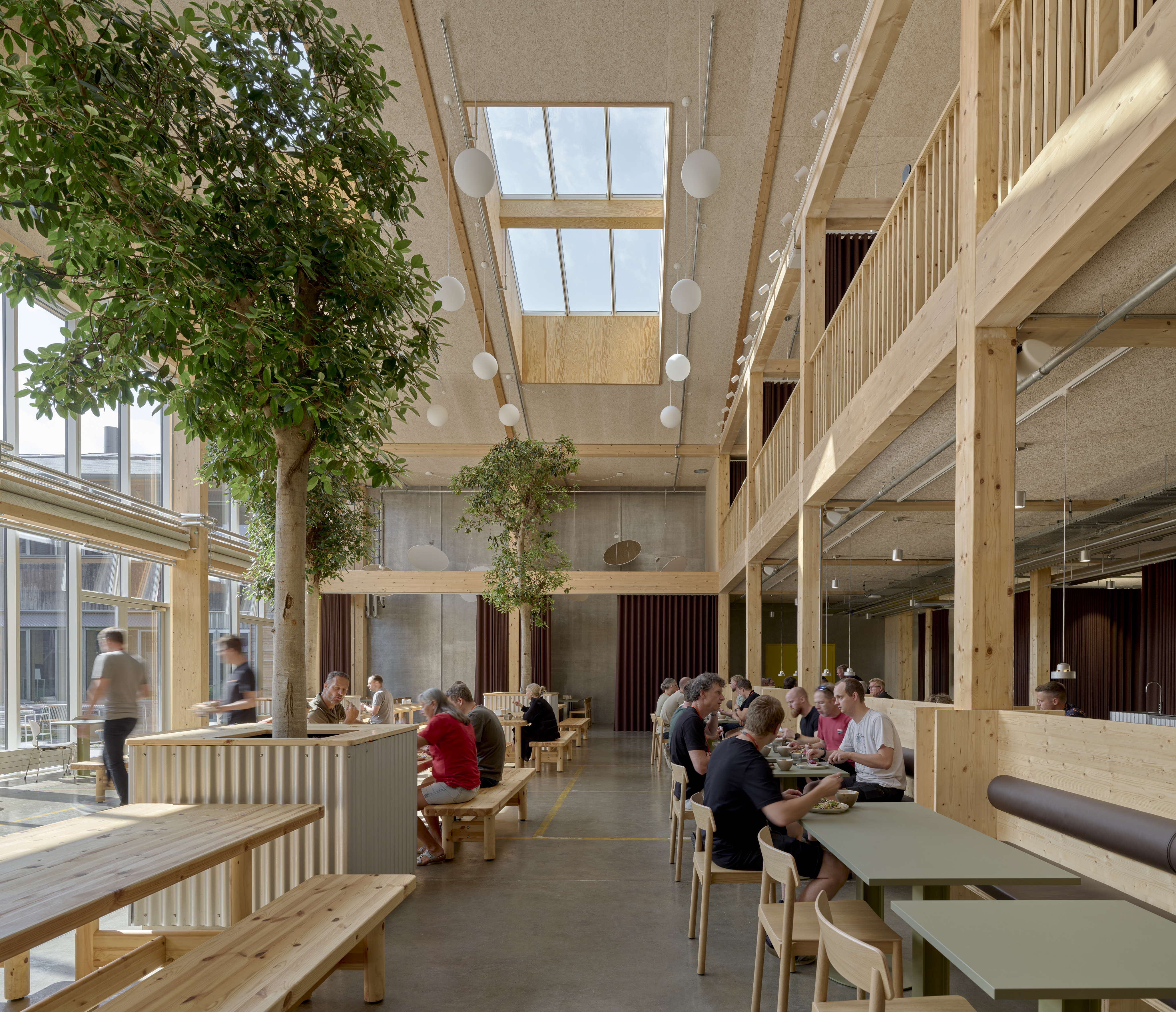 Mette Tony weiter: „Wir suchen immer nach der Koexistenz von Alt und Neu, um das Beste aus beiden herauszuholen und eine Einheit zu schaffen, denn man muss sich auch bewusst sein, dass man nicht der letzte Architekt ist, der hier arbeitet. In 20 Jahren kommt jemand Anderes und baut das Ganze neu auf.“ Eine der wichtigsten Aufgaben sei es gewesen, Tageslicht hereinzulassen. Hierzu wurden in den geschlossenen Baukörper des Lagers zwei Atrien eingeschnitten und begrünt. Dies sei der erste Schritt für deutlich mehr Tageslicht im Innern und für mehr Blickverbindungen zur Natur im Äußeren gewesen. Um zusätzlich in der Tiefe des Gebäudes helle Arbeitsbedingungen zu schaffen, wurde das riesige Dach zu einer Landschaft aus Velux Dachfenstern umgestaltet. Umgesetzt wurde dies mit 387 elektrisch betriebenen Schwingfenstern, zwei Ausstiegsfenstern mit Türfunktion für den Handwerkerausstieg auf das Dach und 26 Modular Skylights, alle 3-fach-verglast. Für angenehme Temperaturen auch im Sommer wurden alle Dachfenster mit außen liegenden Hitzeschutz-Markisen ausgestattet. Bei den Modular Skylights wurden innen Sonnenschutz-Rollos angebracht.