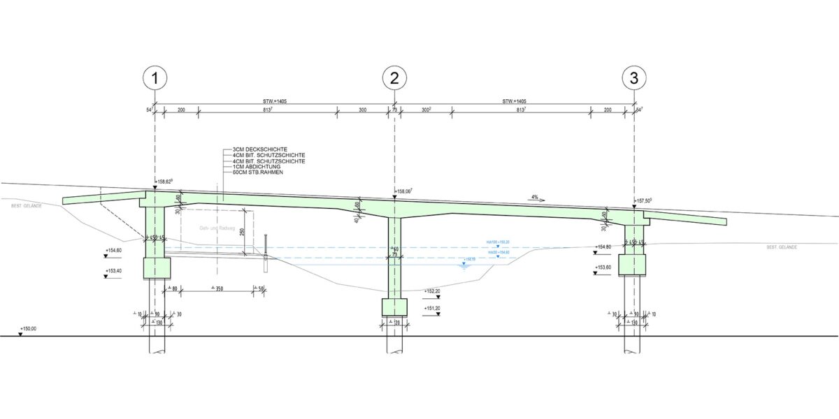 Längsschnitt zweifeldrige Stahlbetonbrücke Grafik: Tecton Consult Engineering ZT GmbH