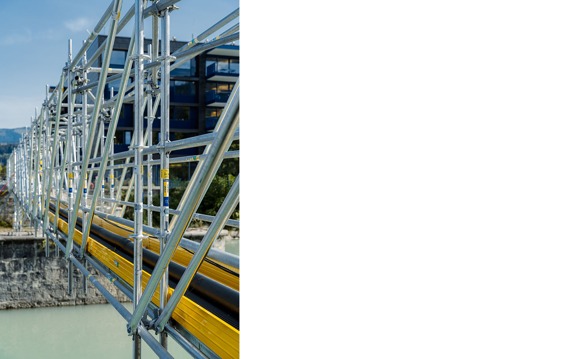 Bei der sanierungsbedürftigen Kühbrücke in Hallein (Österreich) müssen Tragwerk und Oberbau erneuert werden. Während der Bauzeit wurde das Modulgerüst Ringlock als Kabelbrücke eingesetzt.