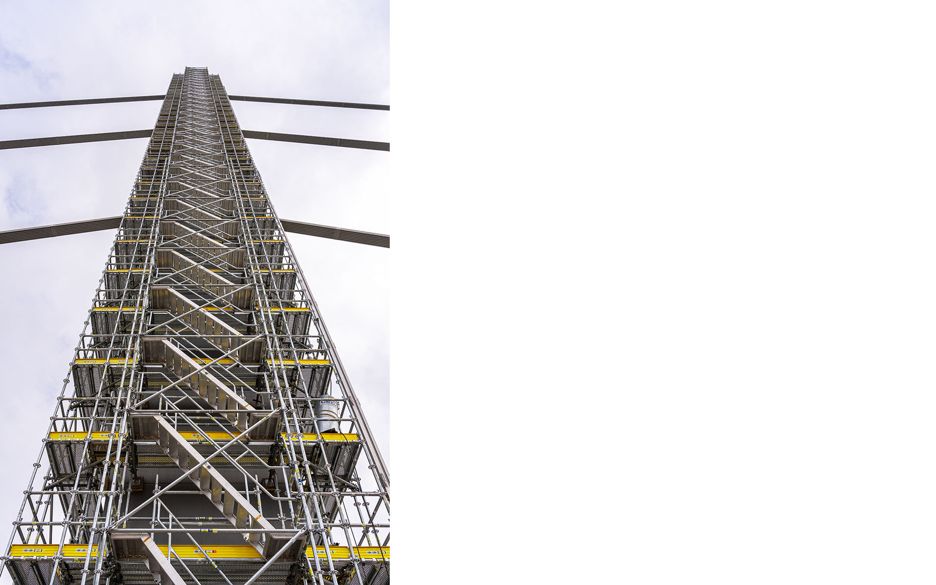 Auf der A7 (Mühlkreisautobahn) in Linz wurde auf der Voest-Brücke ein 70 Meter hoher Pylon für Sanierungsarbeiten mit dem Ringlock-Modulgerüst eingehaust.