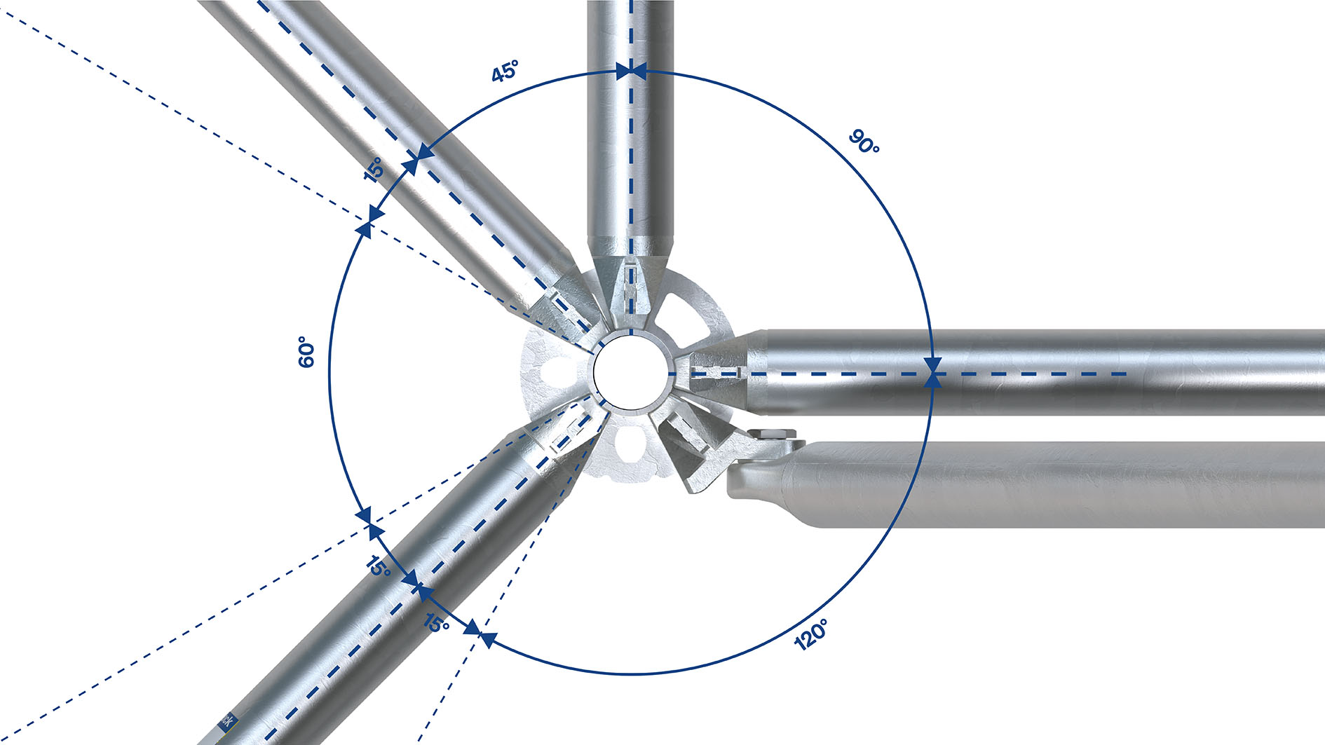 Mittels Keilkopfverbindung werden die horizontalen Bauteile an die Lochscheiben der Vertikalstiele form- und kraftschlüssig angeschlossen.