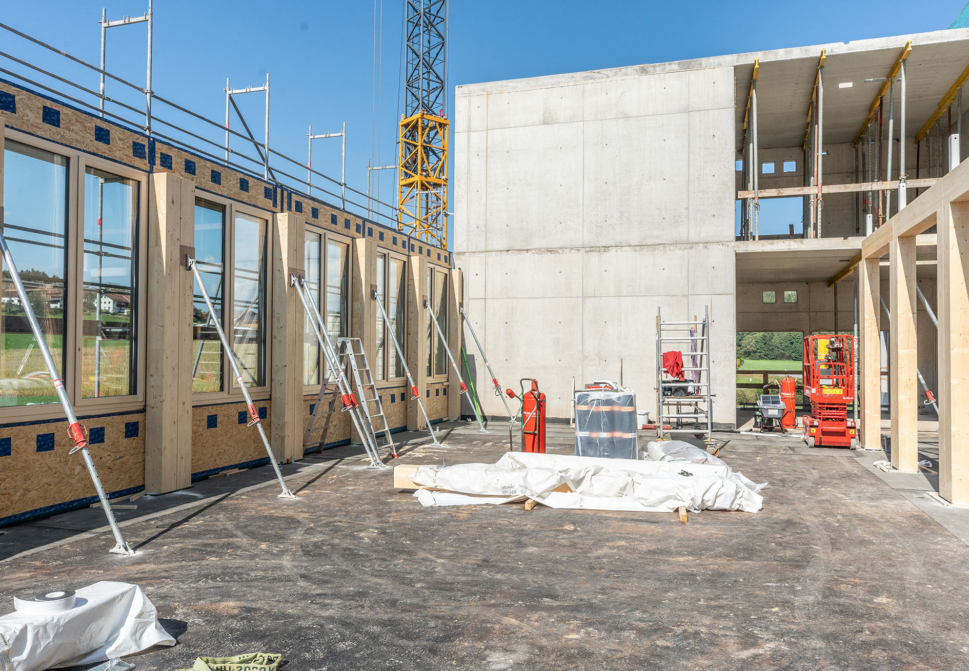 Die Wandelemente weisen einen hohen Vorfertigungsgrad auf, Dies verkürzt auch die Abläufe auf der Baustelle.