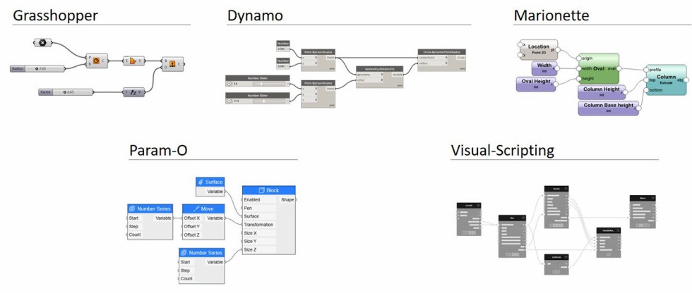 In den späten 2000er-Jahren fand die parametrisch-visuelle Entwicklungsumgebung Grasshopper (GH) für Rhinoceros Eingang in die architektonische Entwurfspraxis [5]. Die Stärken der VP wurden in den nachfolgenden Jahren schnell von den Softwareentwicklern der Architektur-, Ingenieur- und Baubranche erkannt und entsprechende Algorithmeneditoren für weitere Programmfamilien entwickelt (siehe Bild 1): unter anderem Dynamo für Revit (2011), Marionette für Vectorworks (2015), Visual Scripting für Allplan (2019) und Param-O für Archicad (2020).