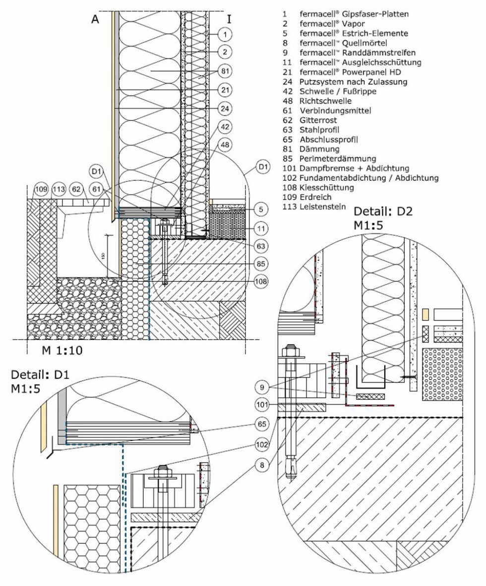 Das Fassadenelement endet unten mit einer auskragenden Schwelle aus statisch ansetzbarem Schichtholz und wird unterseitig angedichtet. Auf diese Abdichtung ist die Fassadenschutzbahn zu verkleben oder anderweitig dauerhaft anzuschließen. Die Perimeterdämmung des Kellers beziehungsweise der Bodenplatte stößt von unten gegen die Schwelle. Damit sitzt die Schwelle – bauphysikalisch günstig – im warmen Bereich der Konstruktion. Die Perimeterdämmung ist noch abzudecken, zum Beispiel mit einem Sockelputz oder einem Sockelblech.