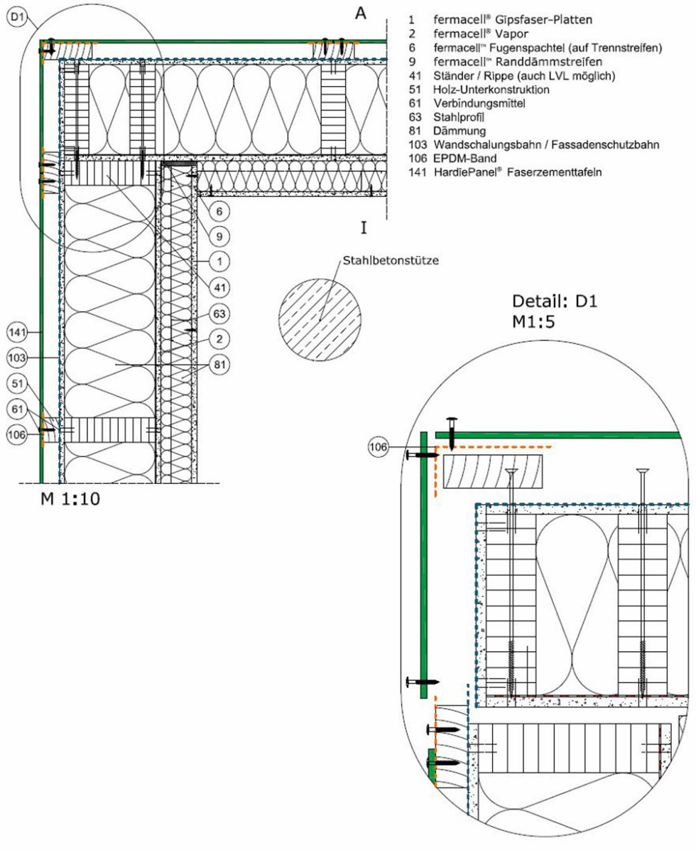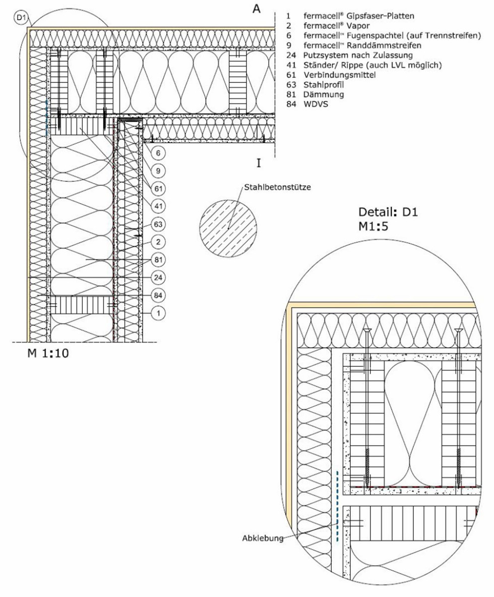 Die Fassade ist als hinterlüftete Fassade auszuführen. Die Fassadenbekleidung wird im Deckenbereich durch eine Brandsperre aus Stahlblech (z. B. 1,5 bis 2,5 mm stark, Befestigung alle 30 cm) unterbrochen. Die Auskragung ist von der Art der Lattung (senkrechte Lattung oder Kreuzlattung) abhängig. Die äußere Beplankung der Holzkonstruktion mit Gipsfaserplatten ist im Deckenbereich ohne Unterbrechungen auszuführen. Die dabei auftretende Fuge ist bauseits auszuführen beziehungsweise nachzuarbeiten. Hierbei sind die Verarbeitungsrichtlinien zur Befestigung und Fugenausbildung zu beachten und mit den Ausführenden zu besprechen (Achtung: Hier besteht ein hohes Fehlerpotenzial!).