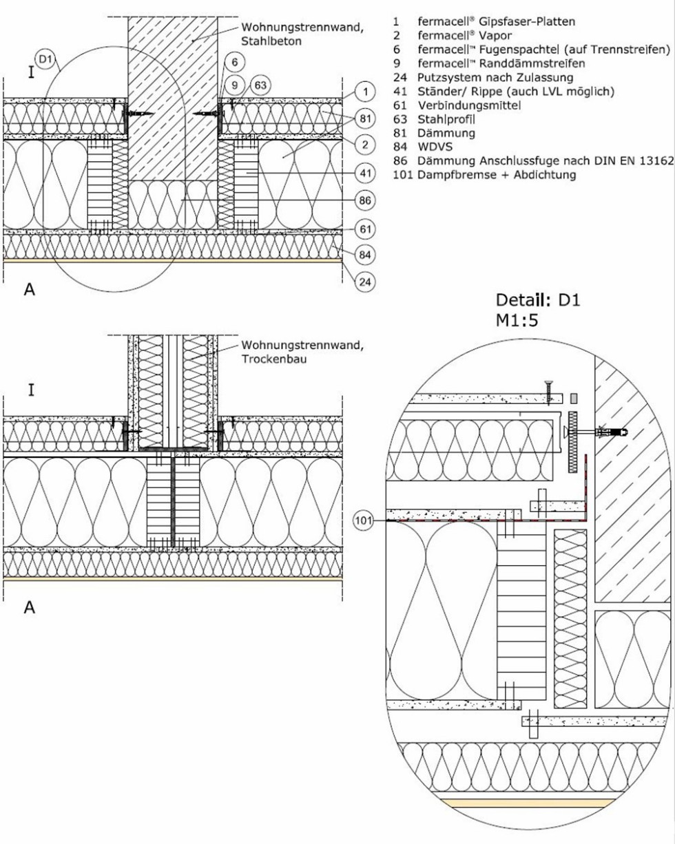 Die Elemente der Fassade müssen im Bereich der Wohnungstrennwand getrennt werden. Die dadurch entstehenden Fugen sind mit Mineralwolle (Schmelzpunkt ab 1000°C) vollständig auszustopfen. Die äußere Gipsfaserplatte und die Dämmung vor der Stirnseite der Trennwand können nur bauseits ausgeführt werden. Die Befestigung der Gipsfaserplatte und die Fugenausbildung muss gemäß Anwendbarkeitsnachweis ausgeführt werden. Dies muss gegenüber den Ausführenden klar kommuniziert werden.