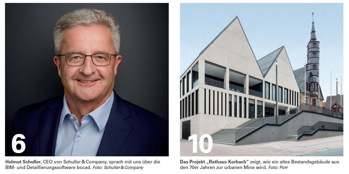 Zum Auftakt des Heftes erklärt Helmut Schuller, Gründer und CEO von Schuller & Company, was ihn so sehr an der BIM- und Detaillierungssoftware bocad fasziniert, dass er sie gleich zweimal gekauft hat.