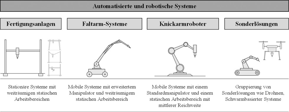 Nachfolgend werden die wesentlichen Charakteristika solcher automatisierten und robotischen Systeme beschrieben, von denen sich vier grundlegende unterscheiden lassen: