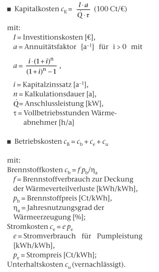 Für die Wirtschaftlichkeit werden die Kapitalkosten nach der Annuitätenmethode bestimmt, während sich die Betriebskosten aus den Brennstoffkosten zur Deckung der Wärmeverluste und den Stromkosten für den Netzbetrieb ergeben. Die Kosten für den Unterhalt werden vernachlässigt. Für die Wärmeverteilkosten c bezogen auf die Wärme am Netzeingang gilt damit c = cK + cB in [Ct/kWh] mit: