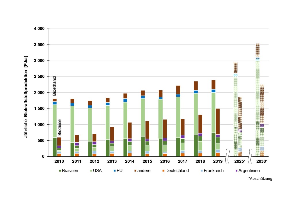 Geht man von einem weltweiten Wachstum der Jahresproduktion von Bioethanol von rund 3 bis 4 % aus, könnte die globale Ethanolproduktion zukünftig auf etwa 3,0 EJ (2025) bis 3,7 EJ (2030) ansteigen; dies entspricht einem Biomasseprimärenergieäquivalent von maximal 6,9 EJ (2025) beziehungsweise 8,4 EJ (2030).