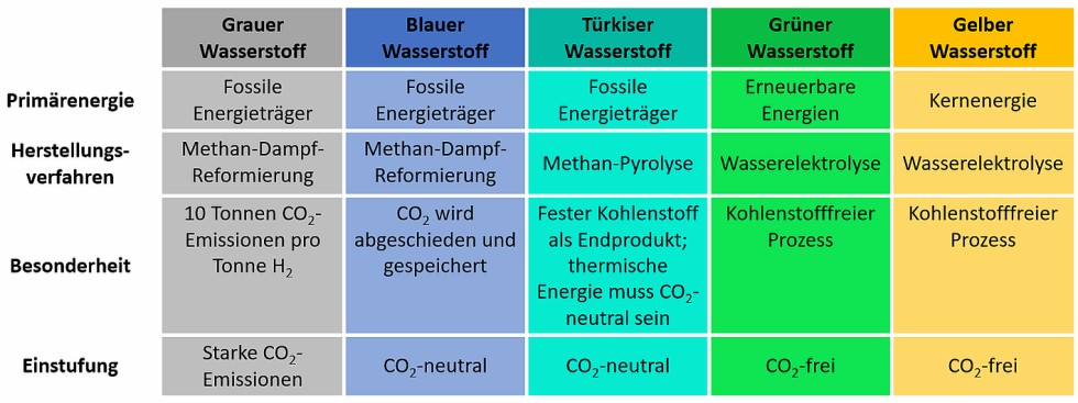 Bild 4 Die Farbenlehre in der Wasserstoffwelt. Gelber Wasserstoff wird zum Teil auch als roter Wasserstoff bezeichnet [1] (eigene Darstellung,