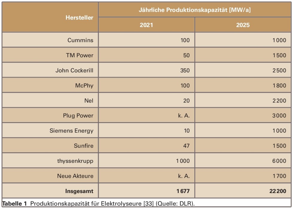 Der rasante Anstieg von Anlagenleistung und -anzahl zeigt deutlich wie schnell der Hochlauf der Wasserstoffwirtschaft derzeit voranschreitet. Dies ist auch sehr deutlich an den steigenden Produktionskapazitäten zu erkennen, die die Elektrolyseurhersteller derzeit aufbauen. Im Januar 2022 wurden diese Bestrebungen in einem Artikel zusammengefasst [49]. Er kommt zu dem Schluss, dass die Herstellung von Wasserstoff inzwischen einer der weltweit gefragtesten Zukunftsmärkte ist und dass sich die Elektrolyseurhersteller derzeit einer enormen Nachfrage gegenübersehen, die es nun zu bedienen gilt. Dazu werden neue Produktionsstätten geschaffen, von denen einige beispielhaft vorgestellt werden sollen. Enapta startete im September 2021 im nordrhein-westfälischen Saerbeck den Bau einer Fabrik, in der ab 2023 monatlich bis zu 10 000 AEM-Elektrolyseure (Anion Exchange Membrane Electrolysis) gefertigt werden können. Das dänische Unternehmen Haldor Topsøe will bis 2023 eine Fabrik für Festoxidelektrolyseure (SOE; Solid Oxide Electrolysis) mit einer jährlichen Kapazität von 500 MW Elektrolyseleistung aufbauen, die auf bis zu 5 GW erweiterbar sein soll. Die größte Produktionskapazität gibt es jedoch bisher bei der etabliertesten Elektrolyseur-Technologie, der PEM-Elektrolyse (Proton Exchange Membrane Electrolysis). Die Thyssenkrupp Industrial Solutions AG hat bereits 2020 angegeben mit der hochautomatisierten Fertigung von solchen Elektrolyseuren im industriellen Maßstab eine jährliche Leistungsnachfrage von 1 GW bedienen zu können. Im Oktober 2021 wurde dann bekannt, dass eine weitere Hochskalierung im Rahmen des BMBF-geförderten H2Giga-Projekts umgesetzt und so auf eine automatisierte Gigawatt-Serienfertigung erweitert wird. Die so vorgefertigte Standardmodule können zu verschiedenen Anlagengrößen bis zu mehreren Gigawatt zusammengeschaltet werden. Im oben erwähnten Artikel sind die aktuellen und geplanten Produktionskapazitäten der größten Hersteller zusammengefasst [49], um zu veranschaulichen, dass mit den aktuellen und geplanten Produktionskapazitäten ein schneller Zuwachs an Elektrolyseleistung umgesetzt werden kann und dass sich die verschiedenen Hersteller auf den wachsenden Zukunftsmarkt ausgerichtet haben (Tabelle 1).