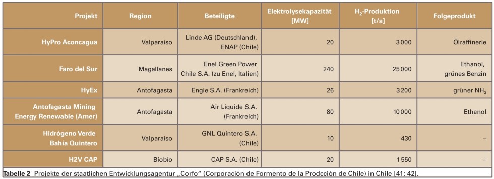 Besonders interessant sind hier verschiedene Projekte, die derzeit in Chile in Planung sind. Chiles Grüner-Wasserstoff-Strategie hat sich das Ziel gesetzt bis 2030 der günstigste Hersteller von Wasserstoff zu sein und bis 2050 zu den drei weltgrößten Exporteuren zu gehören. Hierzu werden Anlagen für grünen Wasserstoff, aber auch für die Weiterverarbeitung zu Ammoniak, Ethanol und weiteren synthetischen Kraftstoffen vorangetrieben. Am 27. Dezember 2021 gab die staatliche Entwicklungsagentur Corfo (Corporación de Formento de la Prodcción de Chile) die Gewinner der internationalen Ausschreibungsrunde für staatlich geförderte Wasserstoffprojekte bekannt (Tabelle 2). Insgesamt weisen die Projekte eine Elektrolysekapazität von 388 MW beziehungsweise 45 000 t grüner Wasserstoff im Jahr aus. Ziel sei dabei eine Inbetriebnahme bis Ende 2025 [58]. Zudem sind bereits die Planungen für zwei weitere Projekte in Chile bekannt. Im Haru-Oni-Projekt sollen schon ab Ende 2022 unter Beteiligung von Siemens Energy und der Porsche AG synthetische, klimaneutrale Elektrokraftstoffe hergestellt werden [59]. Baubeginn der ersten Pilotanlage für 130 l eFuels war der 10. September 2021. In zwei Stufen soll die Kapazität dann bis 2024 auf rund 55 Mio. l und bis 2026 auf rund 550 Mio. l erweitert werden. Des Weiteren wurde im Dezember die Umsetzung des Projektes H2-Magallanes bekannt, dessen Baubeginn für 2025 und dessen Fertigstellung für 2027 vorgesehen sind [58]. Das Projekt umfasst den Aufbau von 10 MW Windenergie, 8 MW Elektrolyse, einer Entsalzungsanlage, einer NH3-Anlage sowie einem Hafen für den NH3-Export. Auch dieses Projekt setzt also auf Ammoniak als Energieträger und Exportgut.