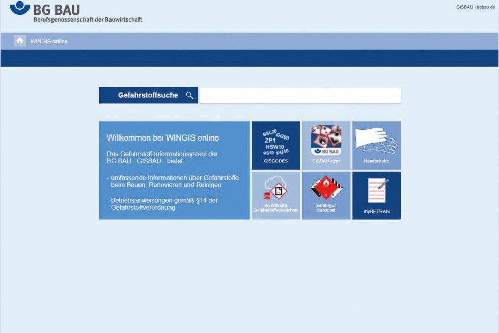 Das Gefahrstoffinformationssystem der Berufsgenossenschaft der Bauwirtschaft (GISBAU) bietet seit vielen Jahren mit WINGIS ein Programm an, das Unternehmen bei diesen Aufgaben unterstützt. WINGIS steht als Onlinetool und als Offlineversion zum Download zur Verfügung (Bild 1). Für die mobile Nutzung besteht zudem die Möglichkeit, WINGISmobile zu verwenden, das als WEB-App auf jedem Smartphone oder Tablet verwendet werden kann: