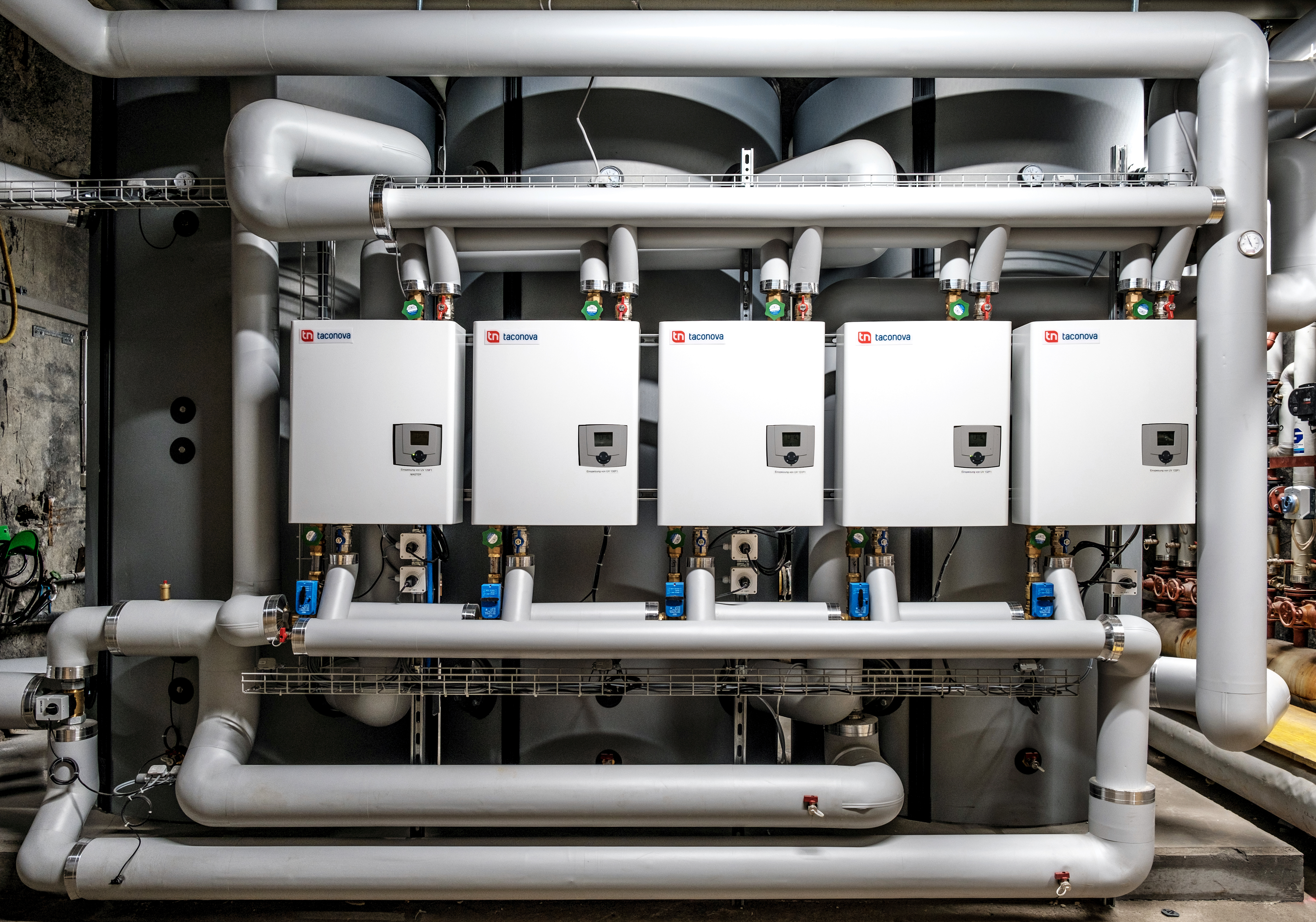 „Bei 124 Zimmern, einem eigenen Restaurant und einem Spa-Bereich ist der Bedarf an Frischwarmwasser hoch“, berichtet Taconova-Planerberater Stefan Radevic. „Wenn ein Großteil der 240 Betten belegt ist und zusätzlich die Stoßzeiten der Küche hinzukommen, ist der Verbrauch zudem temporär stark erhöht. Die Frischwarmwasserstationen müssen dann die volle Auslastung des Warmwasserbedarfs des Hotels abfangen können und auch zu Spitzenzeiten genügend Warmwasser zur Verfügung stellen.“ Hierbei war dem Bauherren eine möglichst effiziente Umsetzung wichtig, die nicht unnötig Strom und Wasser verbraucht. „Glücklicherweise mussten wir uns bei dem Einsatz der Frischwarmwasserstationen keine Sorgen wegen der Größe des Hotels machen“, resümiert Andy Abplanalp. Für einen hohen Warmwasserbedarf mit hoher Gleichzeitigkeit hält das Taconova nämlich eine Lösung bereit, die auch Nutzungsunterbrechungen, beispielsweise in weniger ausgebuchten Phasen des Hotels, abdecken kann. Im „Waldhotel Arosa“ wurden dazu fünf Frischwarmwasserstationen in Kaskade installiert. Die Bevorratung der benötigten Wärmeenergie findet in drei 3 000 Liter-Pufferspeichern mit Betriebswasser statt. Die Stationen arbeiten modulierend und können bei einer 100 prozentigen Hotelauslastung 475 l/min mit einer Entnahmetemperatur von 50 °C problemlos bereitstellen. Im „Waldhotel Arosa“ wurden dafür die Stationen im Heizungskeller des Hotels untergebracht. So sind alle Elemente zentral an einem Platz untergebracht.