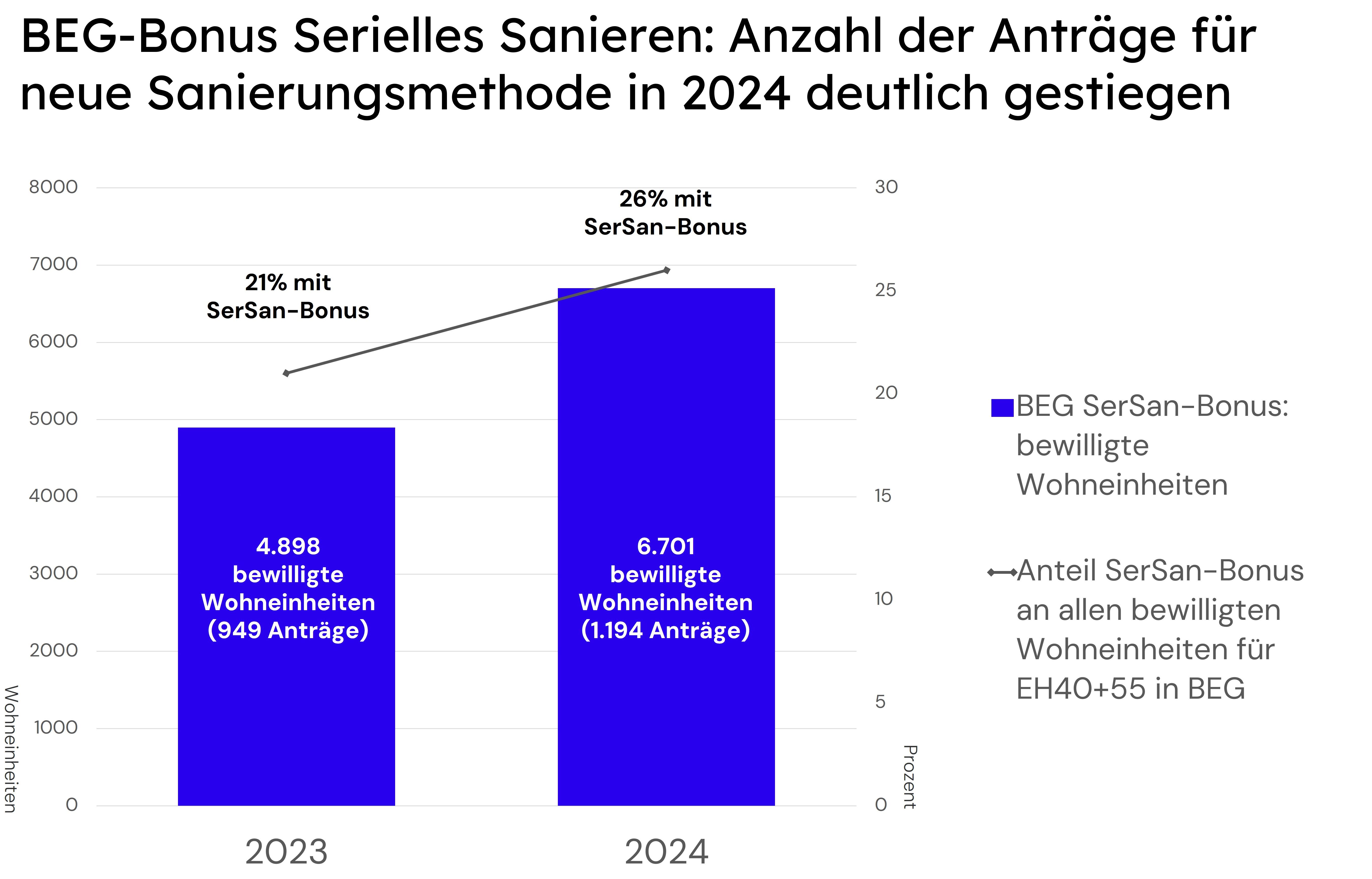 Bis zum Jahr 2022 machten serielle Sanierungen nach Angaben der Deutschen Energie-Agentur (dena) keine zwei Prozent aller hocheffizienten Sanierungen aus. Seit dem Start des BEG-Bonus habe sich der Anteil deutlich gesteigert – auf durchschnittlich 23 Prozent. Damit soll fast jede vierte Sanierung, für die eine Förderung zum Effizienzhaus 40 und 55 bewilligt wurde, seriell umgesetzt werden. Insgesamt entspricht das 2.143 bewilligten Anträgen für rund 11.600 Wohneinheiten.