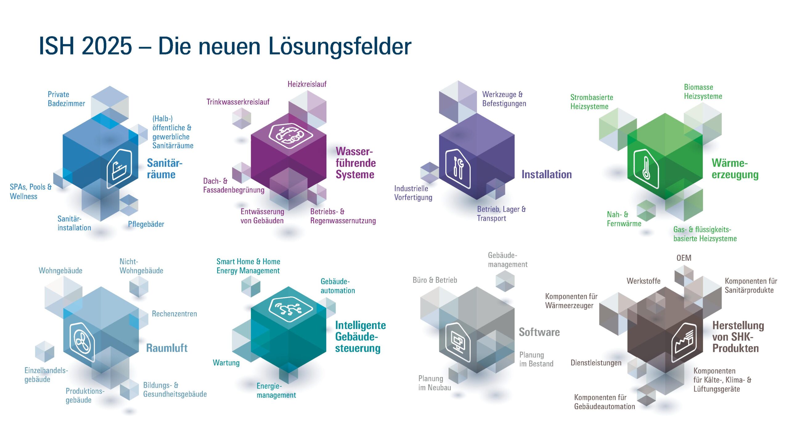 Nach der ISH 2023 haben die Veranstalter das Messekonzept überdacht und für 2025 novelliert. „Die Veranstaltung erlebt im Grunde eine Art Metamorphose von einer reinen Produktschau hin zu einer lösungsorientierten Anwendungsschau“, so Stefan Seitz, Leiter Brandmanagement ISH. Besuchende erwartet eine neue Veranstaltungsstruktur, basierend auf acht Lösungsfeldern. Sie sollen für eine bessere Orientierung und ein „passgenaues Matching zwischen Angebots- und Nachfrageseite“ sorgen. „Das ist die Grundlage, das A und O für einen modernen und starken internationalen Branchentreff,“ erläutert Seitz.
