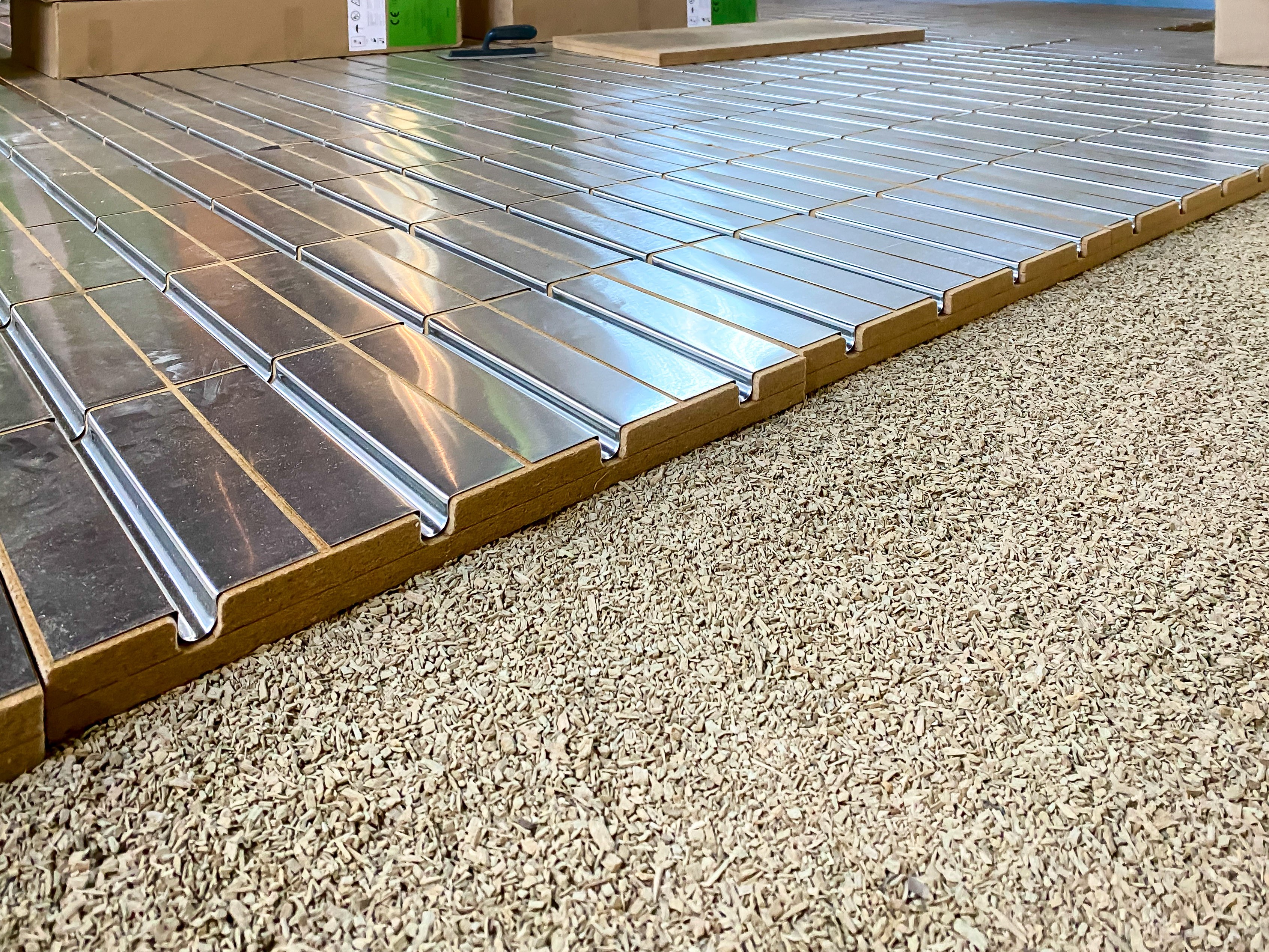 Direkt auf die Ausgleichsschüttung konnten die Holzfaserplatten verlegt werden. Die Mäander-Verlegung erfolgte in die eingefrästen Rillen.