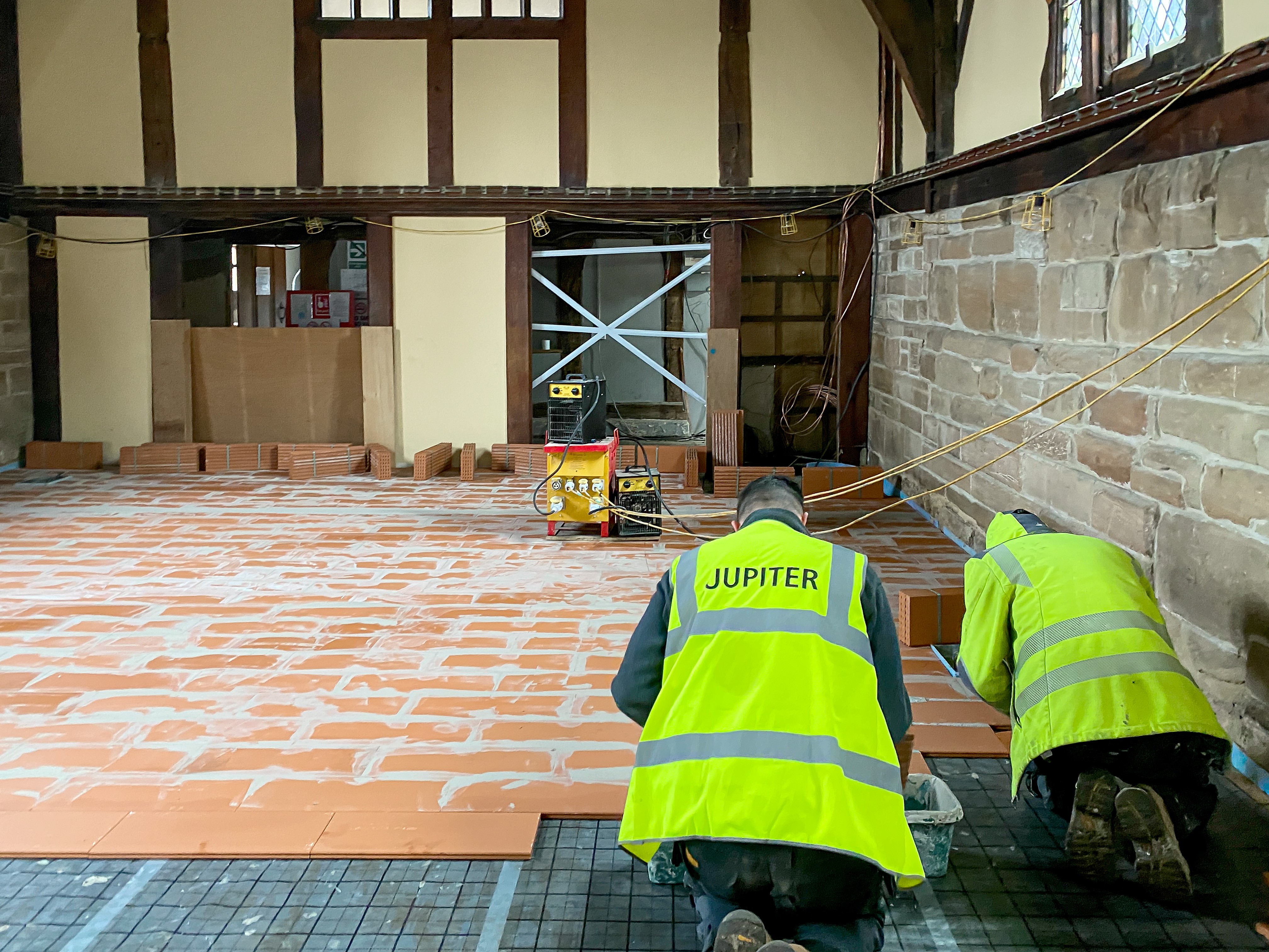 Die ehemalige Great Hall oder auch Kings Hall ist ein 118 Quadratmeter großer Raum innerhalb des Lord Leycester Hospital. Abgesehen von wenigen Ausnahmen wie Sanitäranlagen und dem Boden, bestand dieser Bereich immer noch sichtbar aus den Baumaterialien des 13. Jahrhunderts. Nun sollte die Halle mit einer Fußbodenheizung ausgestattet werden. Doch wie installiert man ein solches System in einem historischen Gebäude mit mittelalterlicher Bausubstanz? Zunächst wurden die Spezialisten der Jupiter Heating Systems Ltd aus Surrey ins Boot geholt. Das Familienunternehmen von Chris und Susan Kollmer hat sich unter anderem auf die Sanierung von historischen Gebäuden spezialisiert.