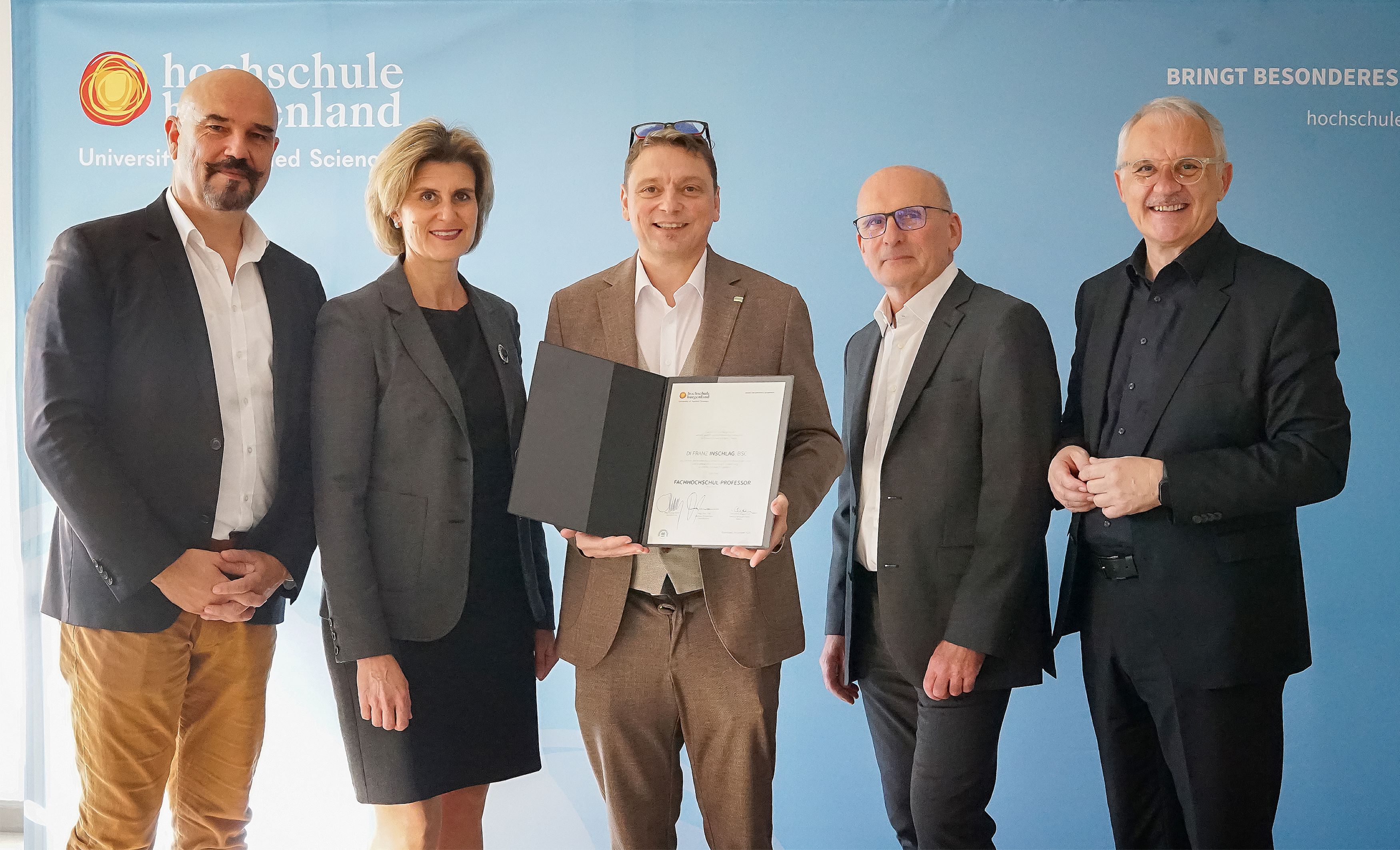 Franz Inschlag, langjährig Lehrender und wissenschaftlicher Mitarbeiter im Department Energie und Umwelt der Hochschule Burgenland, wurde zum Professor (FH) ernannt. Für diesen Titel kann man sich nicht bewerben, man muss dafür vorgeschlagen werden. Voraussetzungen für die FH-Professur sind eine akademische Ausbildung, die Lehrtätigkeit an der Hochschule Burgenland, die facheinschlägige Praxis, angewandte Forschungs- und Entwicklungsaktivitäten sowie besondere Leistungen für die Entwicklung der Hochschule. Inschlags Forschungsschwerpunkt liegt im Bereich der dynamischen Gebäude- und Anlagensimulation. Er begann seinen beruflichen Werdegang als HKLS-Installateur und schloss seinen Lehrberuf mit der Meisterprüfung ab. Später entschied er sich über den zweiten Bildungsweg für eine akademische Laufbahn, absolvierte das Bachelorstudium Energie- und Umweltmanagement mit Schwerpunkt Gebäudetechnik an der Hochschule – damals noch FH – Burgenland und schloss anschließend das Masterstudium Nachhaltige Energiesysteme an. Dabei spezialisierte sich Inschlag auf Technologien wie Biomasse, Solarthermie, Photovoltaik und Kleinwasserkraft. Berufliche Erfahrung sammelte er zunächst in Ingenieurbüros, bevor er 2008 an die Fachhochschule Burgenland wechselte.