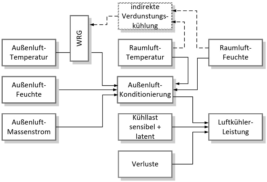 In der 16. Auflage des Rietschel aus dem Jahr 1970 [6] beschreibt das Standardwerk die Komponenten der Kühlleistung von Oberflächenkühlern. Danach ist die Kühlleistung definiert als die Summe aus der sensiblen und latenten Kühllast der konditionierenden Zonen, der Leistungsbeiträge zur Kühlung und Entfeuchtung der Außenluft sowie der zum Ausgleich der Wärmegewinne in Zentrale und Kanalsystem notwendigen Kühlenergie. Das heißt, die Kühlleistung eines Oberflächenkühlers ist größer als die Gebäudeeigenschaft „Kühllast“.