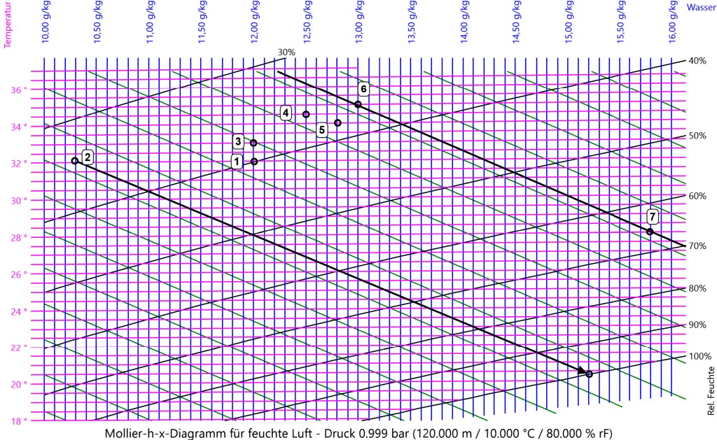 Für eine Feuchtebeladung der in den Luftkühler einströmenden Luft von 15 g/kg ergibt sich bei einer spezifischen Enthalpie von 62,1 kJ/kg eine Lufteintrittstemperatur von 23,8 °C (siehe Linienzug 6). Zum Erreichen der Zuluftfeuchte von 10 g/kg ist ein Energieentzug von 22,5 kJ/kg notwendig; die Luftaustrittstemperatur beträgt 14,2 °C. Bei einem theoretischen Außenluftzustand auf der Sättigungslinie, der weiterhin durch die spezifische Enthalpie von 62,1 kJ/kg definiert ist, wird ein spezifischer Energieentzug von 22,8 kJ/kg zum Erreichen der Zuluftfeuchtebeladung von 10 g/kg benötigt. Die Luftaustrittstemperatur liegt bei 13,8 °C (siehe Linienzug 7).
