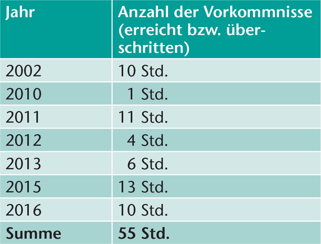 Eigene Untersuchungen der vom DWD (2017) frei erhältlichen Wetterdaten für Mannheim (stündliche Werte von Temperatur und relativer Feuchte) haben die von Albers und Eyrich [2] dargestellten Trends bestätigt. Allerdings zeigen die eigenen Auswertungen, dass die Überschreitung der Grenzenthalpie im Jahr 1994 von 68,5 kJ/kg an 11 Tagen mit insgesamt 60 Stunden stattfand. Dem gegenüber stehen lediglich zwei Tage mit Temperaturen von mindestens 35 °C. Das zeigt für den Oberrheingraben deutlich die Relevanz der Feuchte für das Überschreitungsrisiko der Grenzenthalpie.