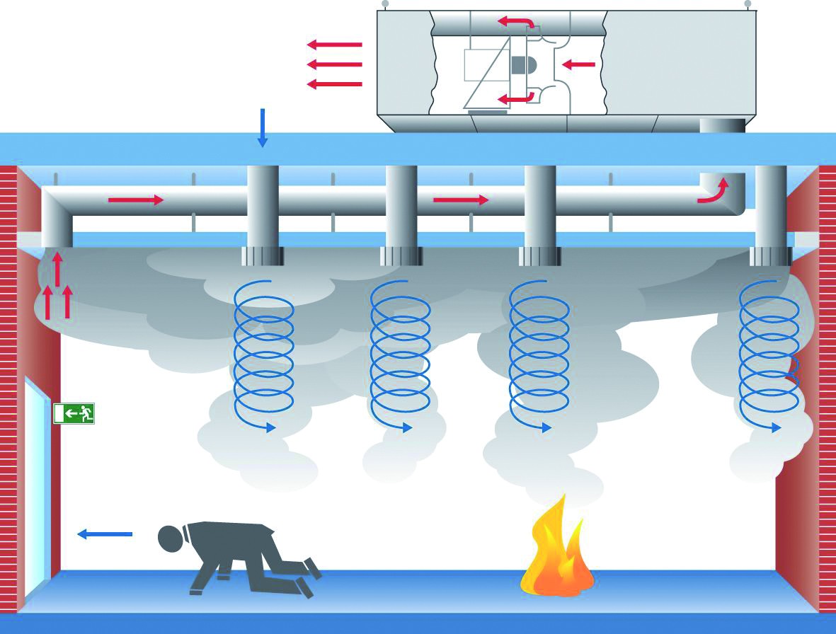 Da im Brandfall über den thermischen Auftrieb die Rauchgase in den Deckenbereich hineinströmen, vermischen sich dort die Rauchgase sehr schnell mit der aus dem Deckenbereich dem Raum wieder zugeführten Zuluft, die danach über den Strömungsimpuls zurück in den Bodenbereichs des Raumes strömt.