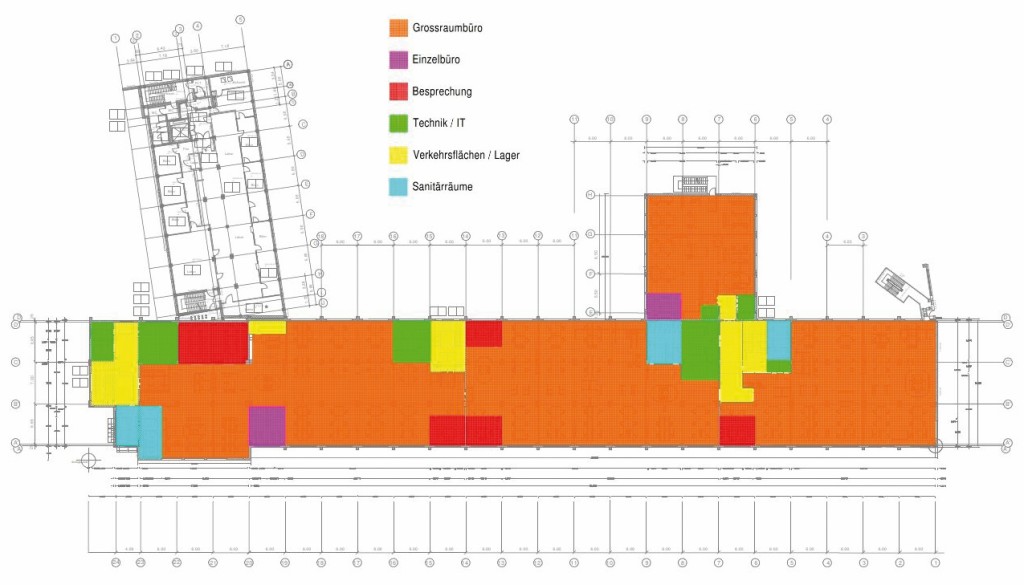 Für die hier vorgestellte Kühllast-Simulation wird lediglich das zweite Obergeschoss betrachtet. Die Geschossfläche beträgt etwa 3 400 m² und wird als größtenteils offenes Großraumbüro mit einzelnen Besprechungsräumen und Einzelbüros genutzt. Die nächsten Bilder zeigen ein 3D-Modell des Gebäudes sowie die Nutzungseinheiten.