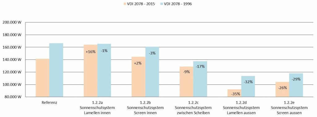 Jede Form der außenliegenden Verschattung führt in beiden Fällen zu einer Reduktion der Kühllast um mehr als 30 %.