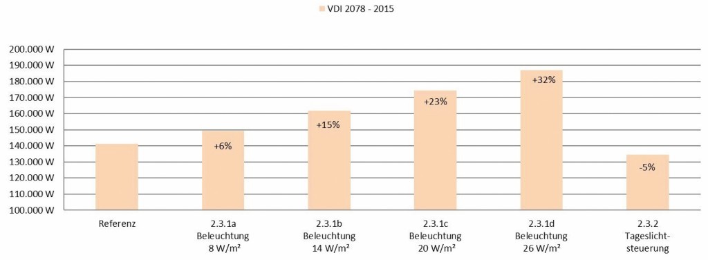 Die flächenbezogene Wärmeleistung variiert hierbei von 4 W/m² mit LED-Technik bis zu 26 W/m² für eine herkömmliche Beleuchtung mit Leuchtstofflampen. Die Ergebnisse können nur für die aktuelle Richtlinie angegeben werden, da eine ebenfalls berücksichtigte Tageslichtsteuerung in der Version von 1996 noch nicht vorgesehen war.