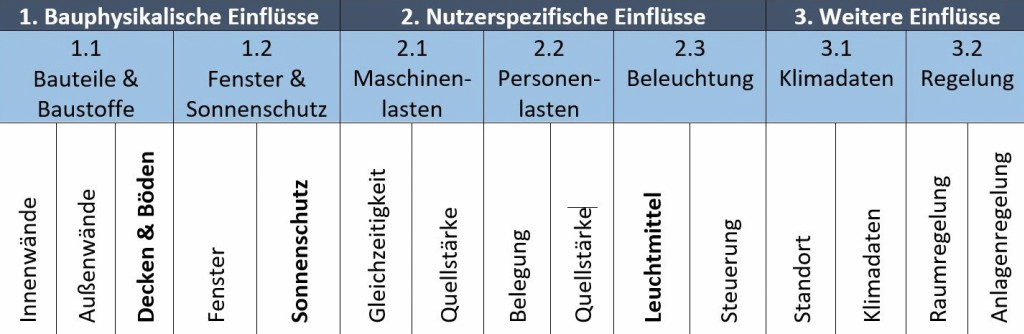 Um die bauphysikalischen und nutzerspezifischen Einflüsse auf die Kühllast eines Gebäudes vergleichen und bewerten zu können, wird eine Vielzahl an Varianten definiert und simuliert. Diese lassen sich in drei Kategorien unterteilen (siehe Tabelle).