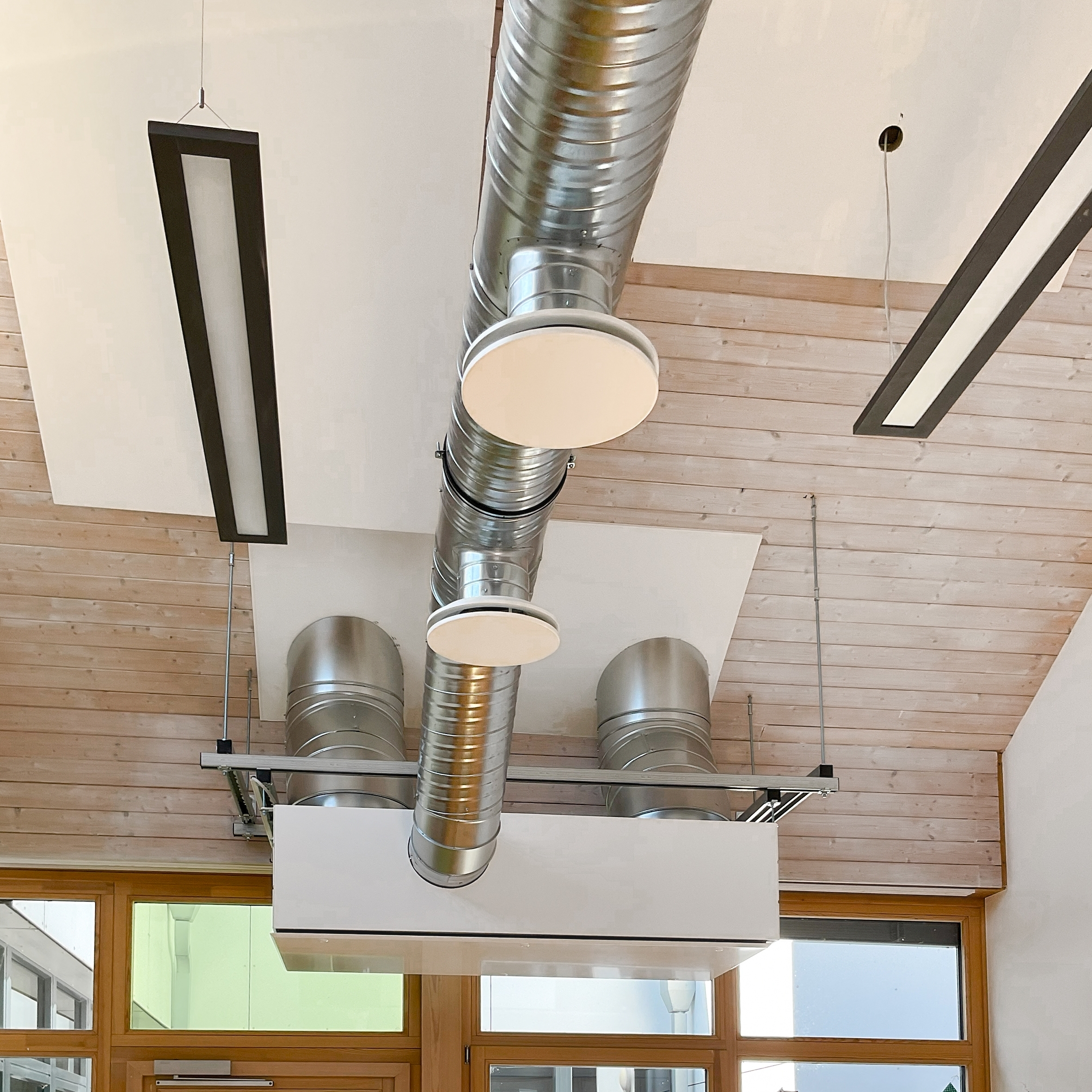 Die Installation der Lüftungsgeräte lässt sich üblicherweise mit minimalem baulichen Aufwand und in kürzester Zeit bewerkstelligen: Hierfür sind lediglich zwei Kernbohrungen in die Bausubstanz notwendig. Während einige der dezentralen Geräte in der Kita Jahnplatz auf diese Weise problemlos installiert werden konnten, wurde es in den Gruppenräumen der Kita kniffeliger. „Wegen des Schrägdachs funktionierte der Coanda-Effekt, der für eine optimale Luftverteilung im Raum sorgt, nicht. Das dezentrale Gerät wurde daher wie ein klassisches zentrales Lüftungssystem an ein Kanalnetz angebunden“, erläutert Udo Rausch. In enger Absprache mit dem Ingenieurbüro Reihsner, das für die Statik verantwortlich war, entwickelten die Planer von Bayer & Friedrich eine Speziallösung, die gleichermaßen funktional und optisch möglichst unauffällig war. „Die Holzbalkenkonstruktion unter der Decke wurde genutzt, um daran die nötigen Lüftungsrohre zu montieren“, berichtet Kai Schäfer, Planer bei Bayer & Friedrich. „Zusätzlich wurden Traversen eingezogen und mit Gewindestangen abgehängt, an denen wir dann die Lüftungsgeräte befestigt haben.“
