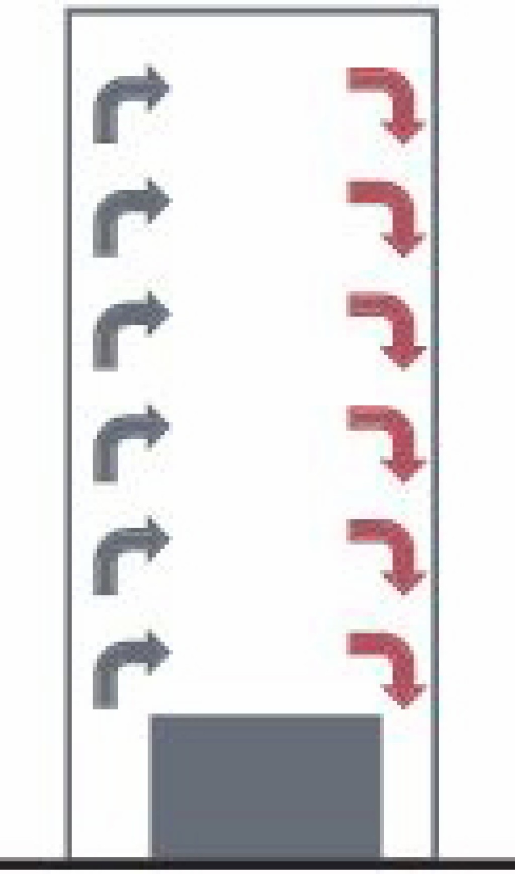 Die kühle Zuluft wird in diese Gänge eingebracht. Sie werden daher als Kaltgänge bezeichnet. Die eingeströmte Luft wird beidseitig von den Racks angesaugt und nach ihrer Durchströmung erwärmt in die sogenannten Warmgänge abgegeben. Von dort steigt sie zur Raumdecke und wird als Abluft der RLT-Anlage zur Rückkühlung wieder zugeführt. Mit dieser Luftführung sind Leistungsdichten bis 2 kW/m² und bis 8 kW je Rack behandelbar. Leistungsmindernd können sich zwei Vorgänge auswirken: Zum einen können Bypassströmungen an den Stirnseiten der Warm- und Kaltgänge auftreten, zum anderen kann Luft aus den Kaltgängen ungenutzt in den Abluftbereich strömen.