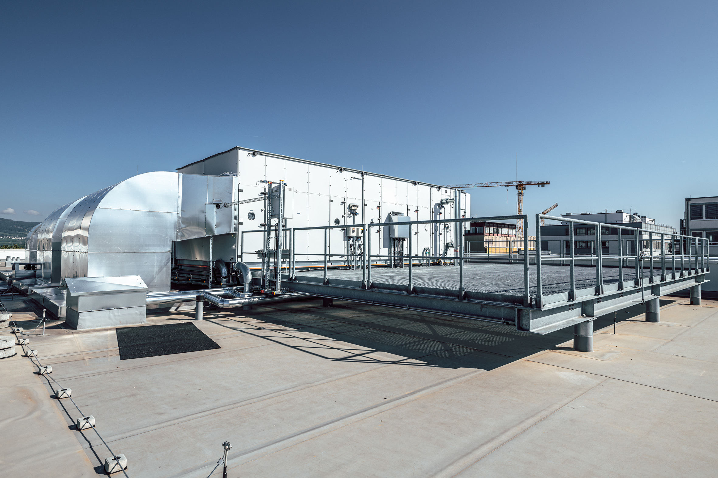 Eine weitere Anforderung an die Lüftungsanlagen war die Reduzierung des Energieverbrauchs durch ein Wärmerückgewinnungssystem. „Wir mussten einen Wirkungsgrad von größer oder gleich 70 Prozent erreichen – das war die Vorgabe von Boehringer Ingelheim. Klar, denn jedes Prozent Wirkungsgrad weniger kostet später viel Geld. Ein hoher Wirkungsgrad ist nicht nur kosten-, sondern auch umweltschonend“, so Uwe Speidel. Die raumlufttechnischen Anlagen wurden daher mit einem EcoCond-System ausgestattet. EcoCond und EcoCond+ sind Wärmerückgewinnungssysteme zum Heizen und Kühlen. Die Betriebsweise des Systems senke nachweislich, so der Hersteller, die Lebenszykluskosten raumlufttechnischer Anlagen. Durch die Trennung der Luftströme sind eine Stoff- und Brandübertragung im Brandfall ausgeschlossen. Damit eignet sich das System besonders für den Einsatz in Anlagen, in denen keine Keime, Gerüche, Feuchtigkeit, Schadstoffe und sonstige Kontaminationen übertragen werden dürfen. Das gilt ebenso für Umgebungen mit aggressiven Medien oder Prozessabwärme.